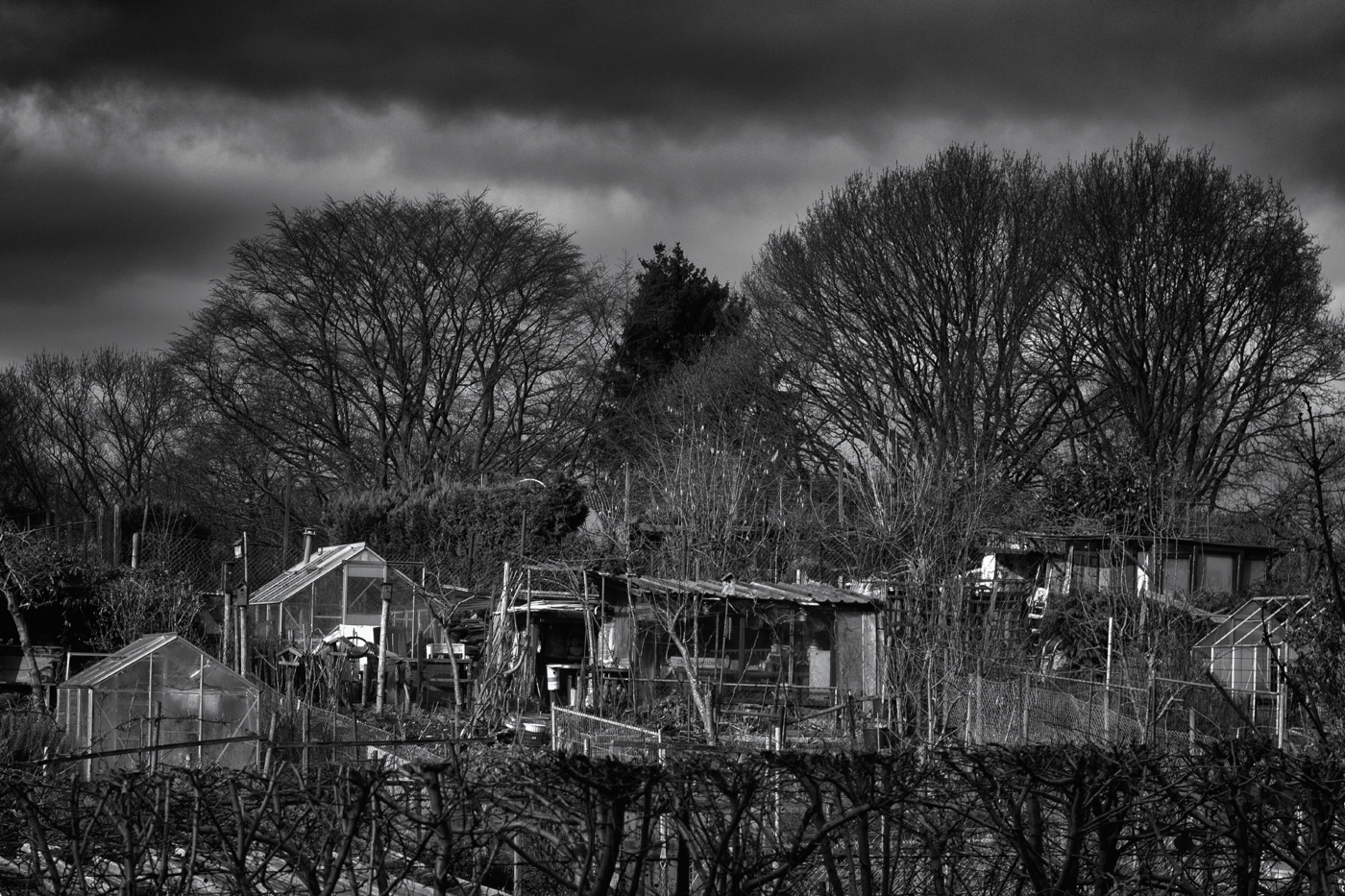 Volkstuintjes Arnhem Zwartwitfotografie Fotografie Verborgen Landschap Bomen Verscholen Kassen Objecten Tuintjes