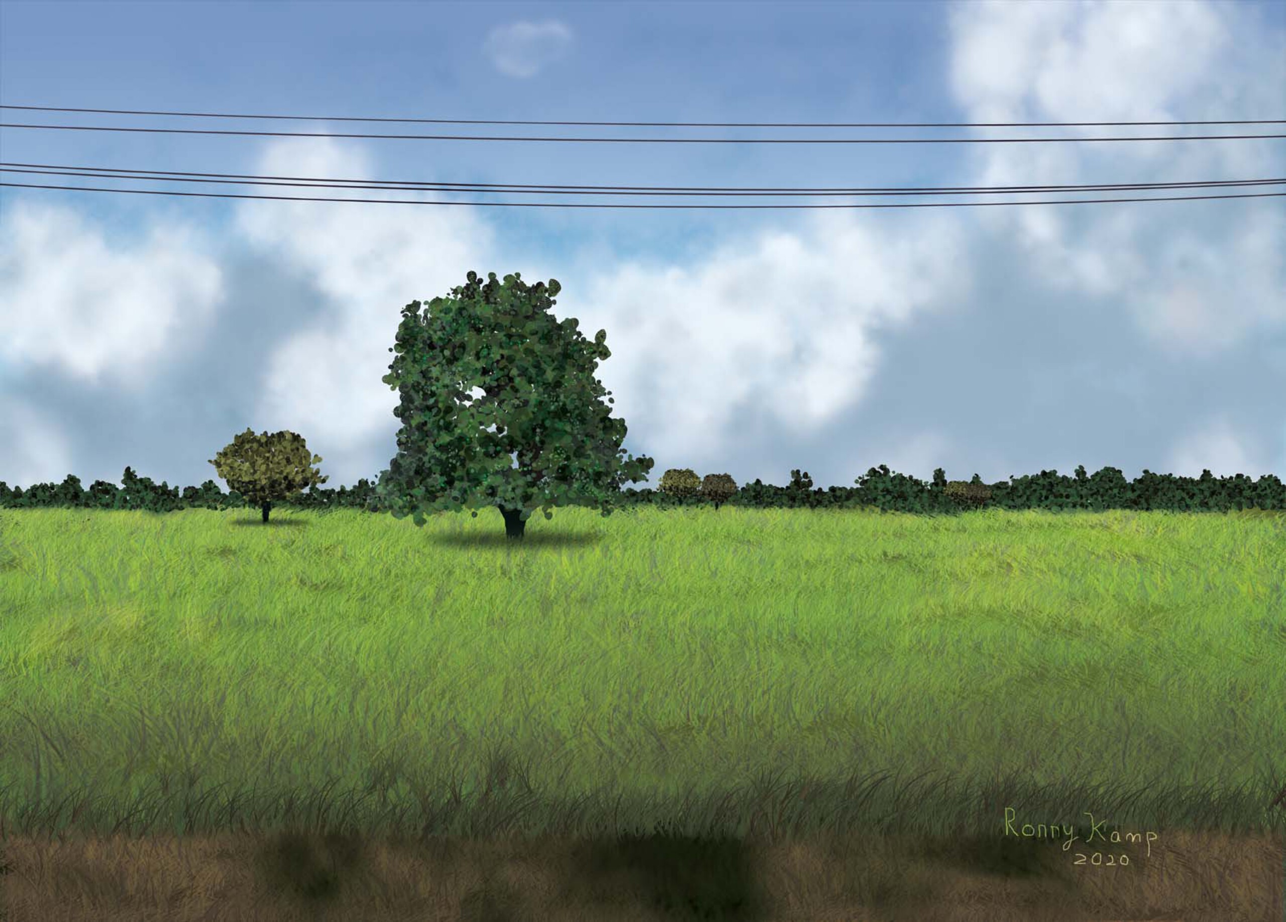 Thais landschap met bomen en wolken achter elektriciteitskabels. Zo zou je het in Nederland ook kunnen zien. De schaduw onder de boom verraadt echter anders. Alleen rond de evenaar kan de zon recht boven ons staan.