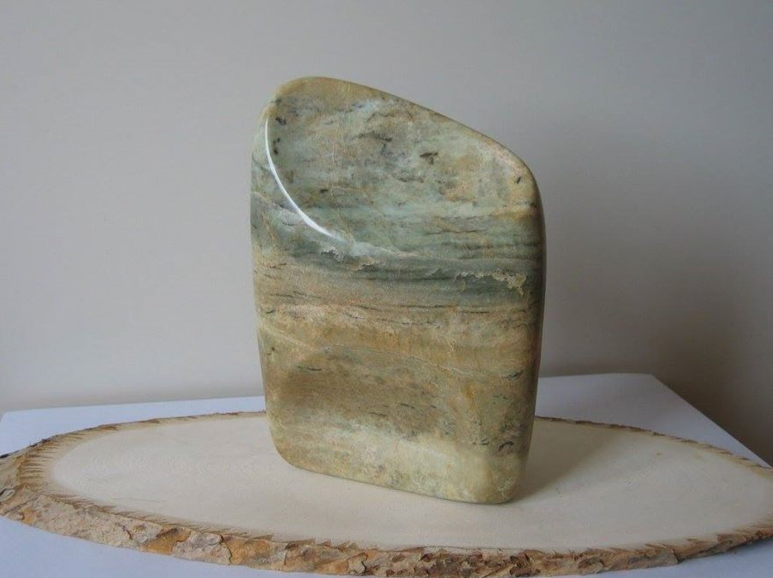 Abstract beeld van Braziliaans speksteen. De steen heeft lagen in verschillende kleuren.