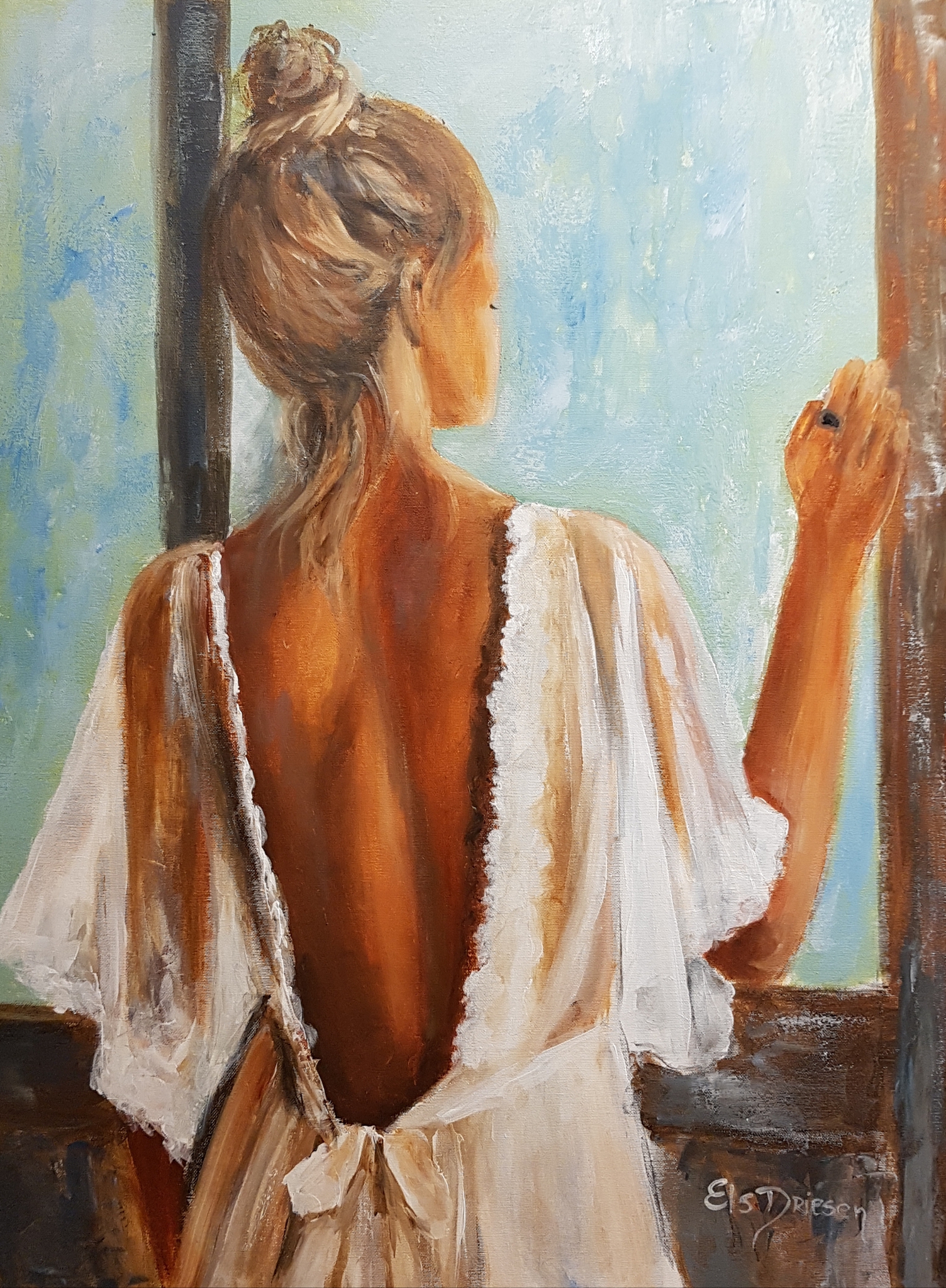 Vrouw Woman Kunst Girl Romantisch Raam Romantic Slaapkamer Bedroompainting Walldecor
