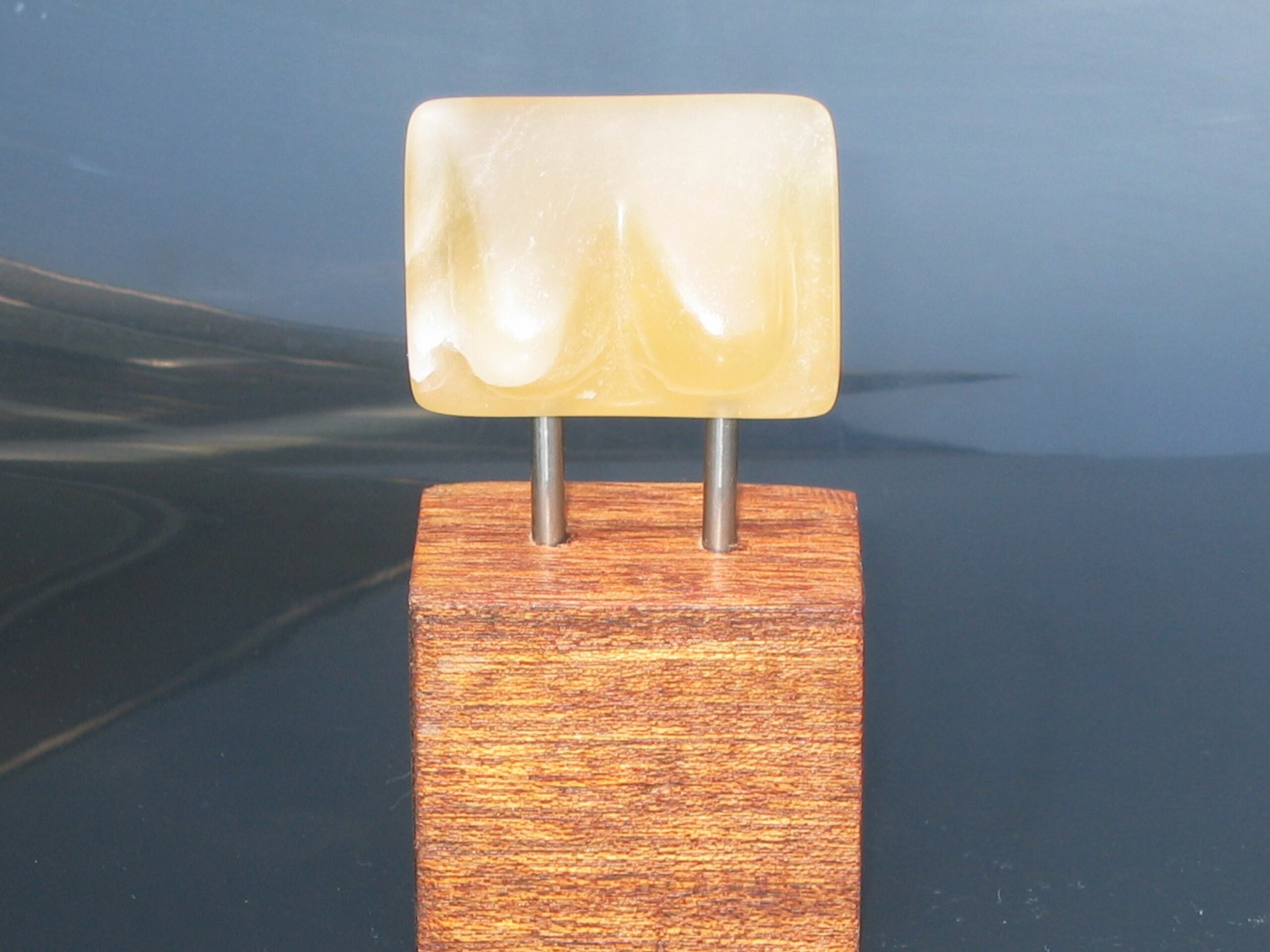 Zalmkleurig albasten beeldje op een sokkel van hardhout