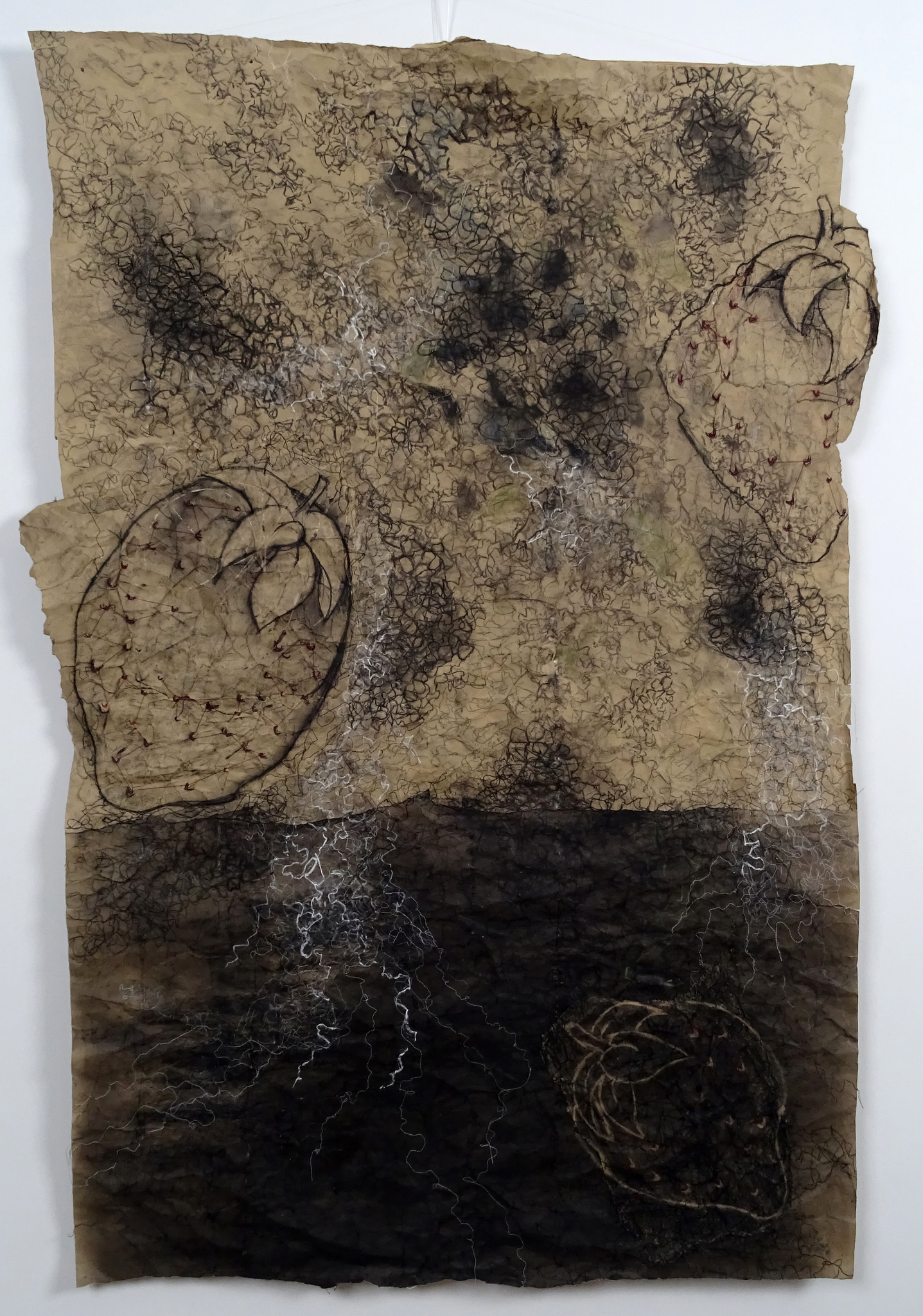 Houtskool, grafiet, syberisch krijt en machinaal borduurwerk