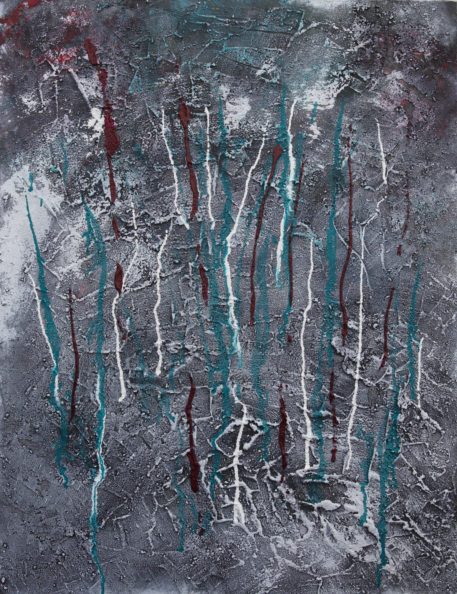 Bij dit schilderij, een vervolg van Frozen tears 1, heb ik ook zand gebruikt als verdikkingsmiddel. Ook heb ik hier het lijden van de mens in verwerkt. De rode tranen symboliseren het geweld wat in de wereld gebruikt wordt om andere mensen in hun macht te krijgen.