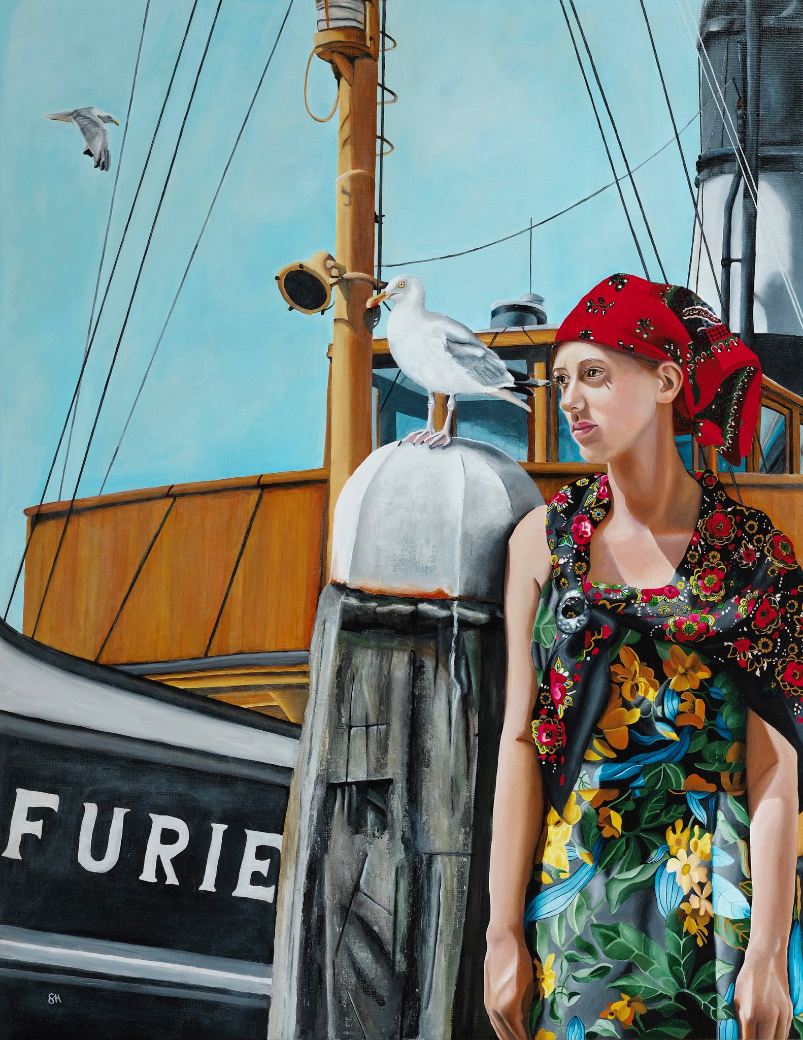 De Furie Acryl op linnen. 70 x 90 cm- met zwarte houten baklijst: 75x95 cm Genomineerd door jury Schilderij van het Jaar 2019 Geïnspireerd door het het schip de “Furie", 1916, Nederlands laatste stoomzeesleper, ligplaats Maassluis. Levering/ bekijken op afspraak.