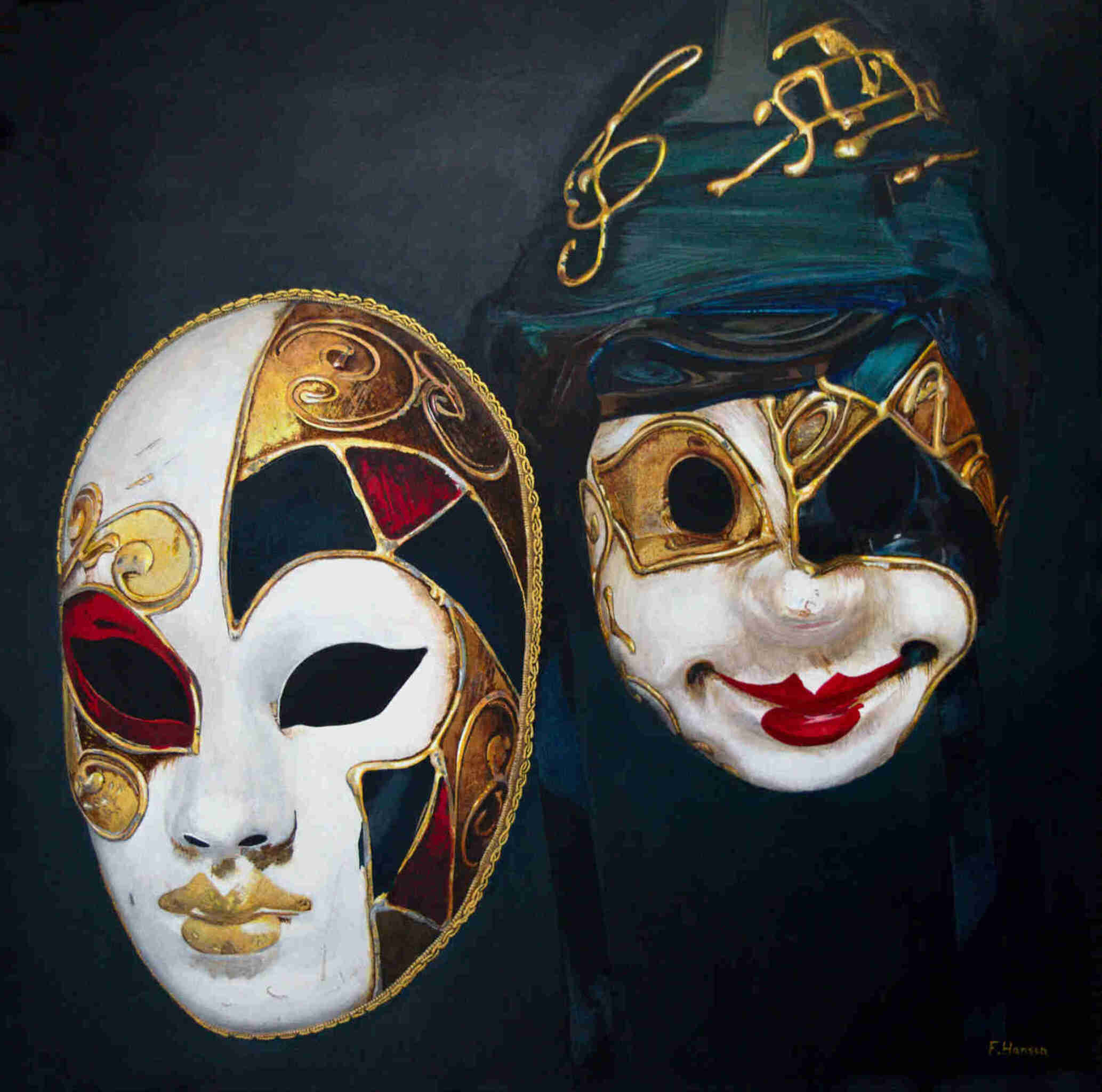 Schilderij: Acryl op canvas. Toen ik in Venetië liep te wandelen , zag ik deze maskers aan de muur van een winkel hangen. Het mysterieuze uiterlijk en de diepe warme kleuren inspireerden me om de maskers op het canvas te zetten. Geschilderd op portretlinnen. Inclusief zwart houten baklijst met ophangsysteem