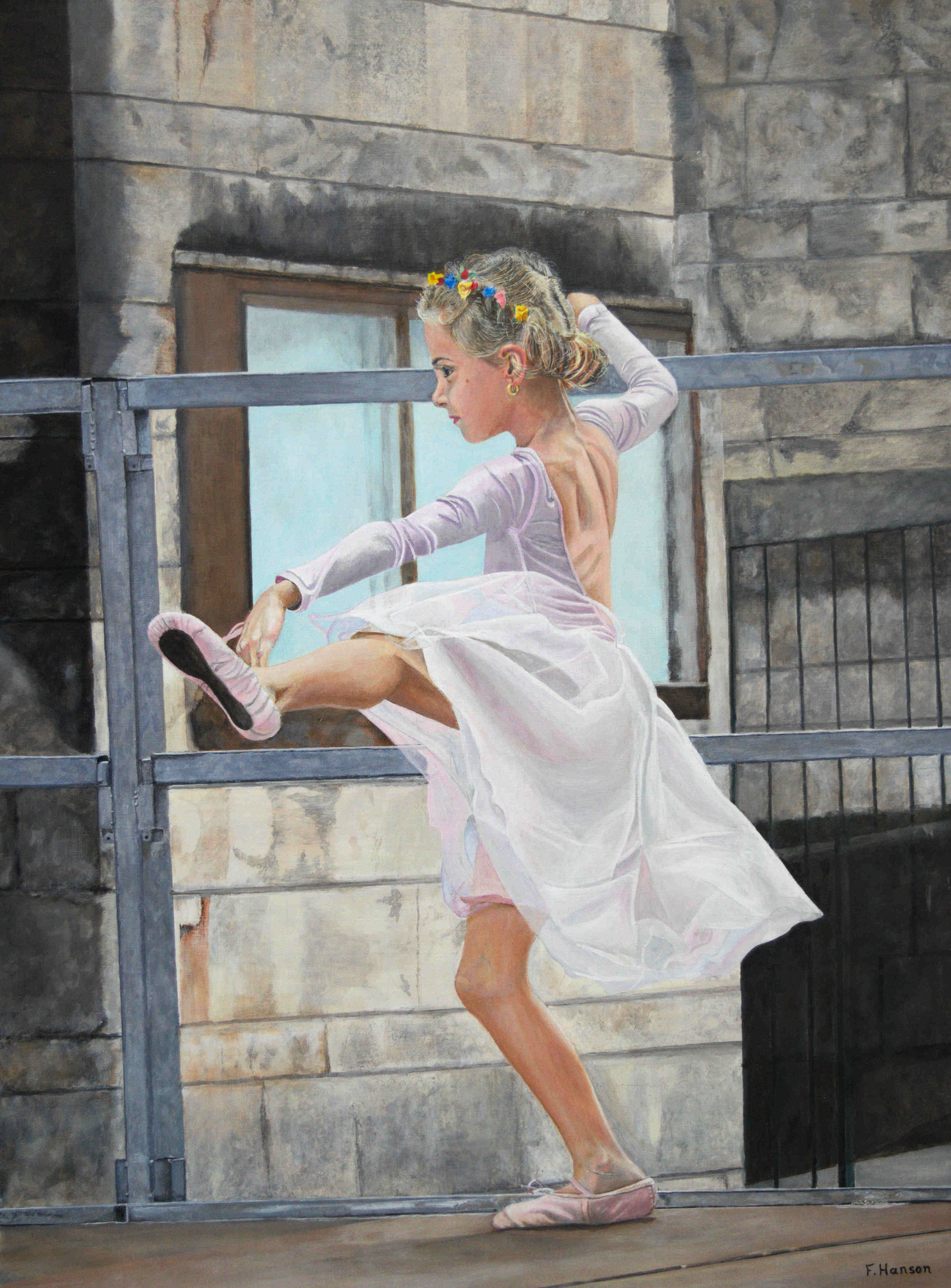 Schilderij: Acryl op canvas. Jonge ballerina die oefeningen doet, net voordat ze in de open lucht op een plein in Toscane Italië moet optreden. Het was een prachtige plaatje ik hoop dat ik de emotie van die dag op het doek heb kunnen overbrengen. Geschilderd op portretlinnen. Zwart houten baklijst met chroomrand inbegrepen