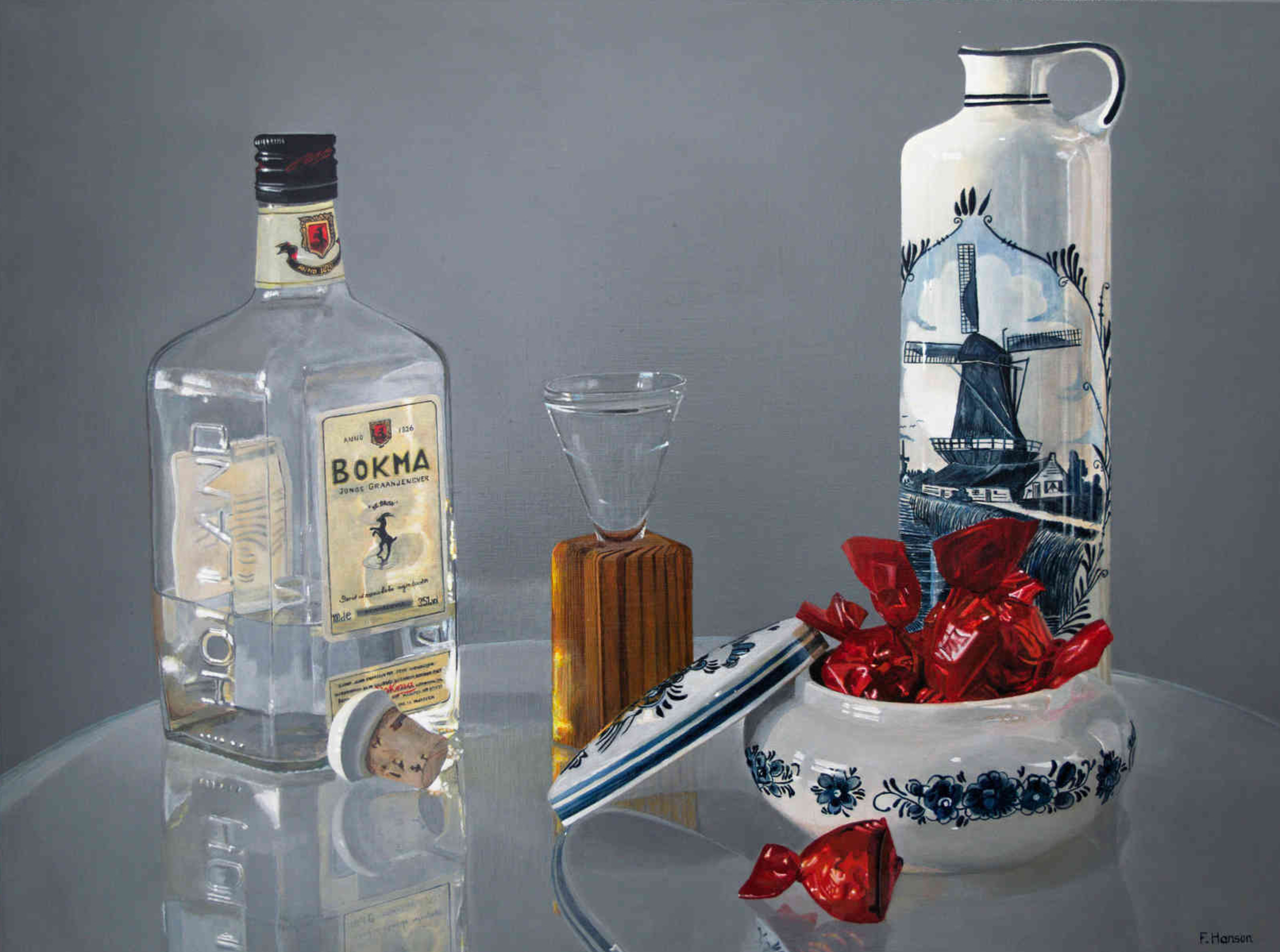 Schilderij: Acryl op canvas. Kunstwerk van de week op Exto 2024 Stilleven van traditionele oud-Hollandse jenever in een delfts blauwe kruik en Bonbonnière met kersenbonbons. De houten glashouder van het jeneverglas is typisch Fries Het zijn kostbare items die ik heb geërfd van een oude tante. Ik kon het niet laten ze op canvas te zetten Geschilderd op portretlinnen. Zilverkleurig houten baklijst inbegrepen