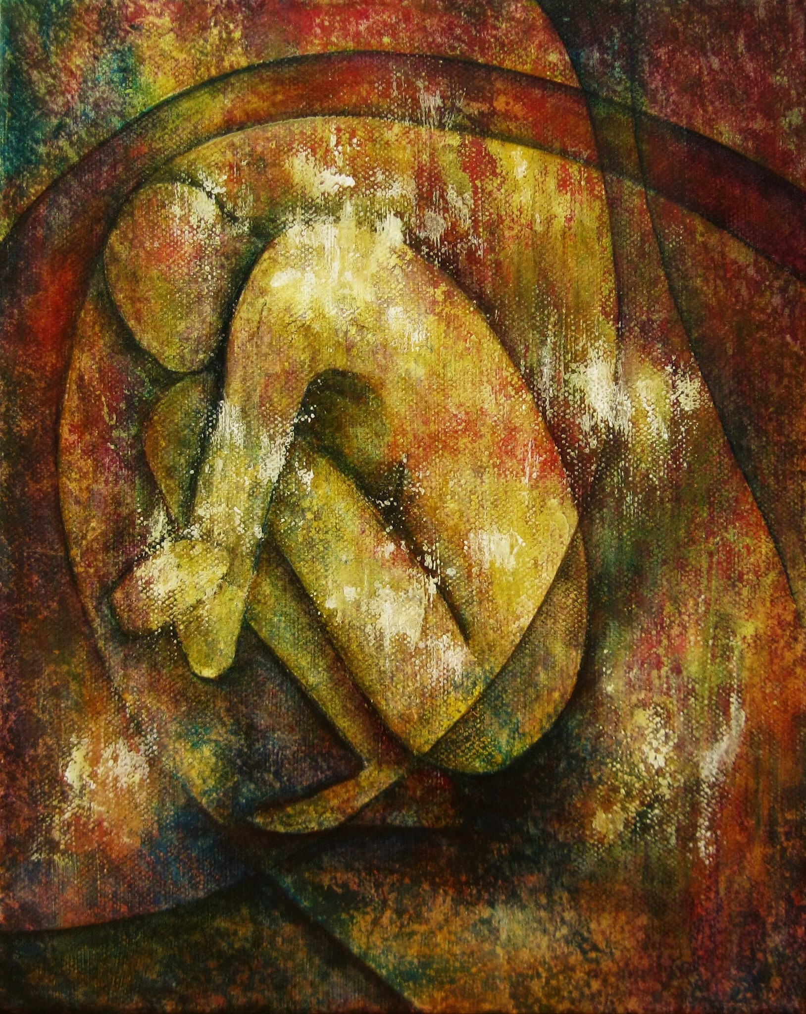 Abstract figuratief schilderij van een kleurrijk vrouwelijk figuur. De vrouw hurkt neer en kijkt naar de grond.