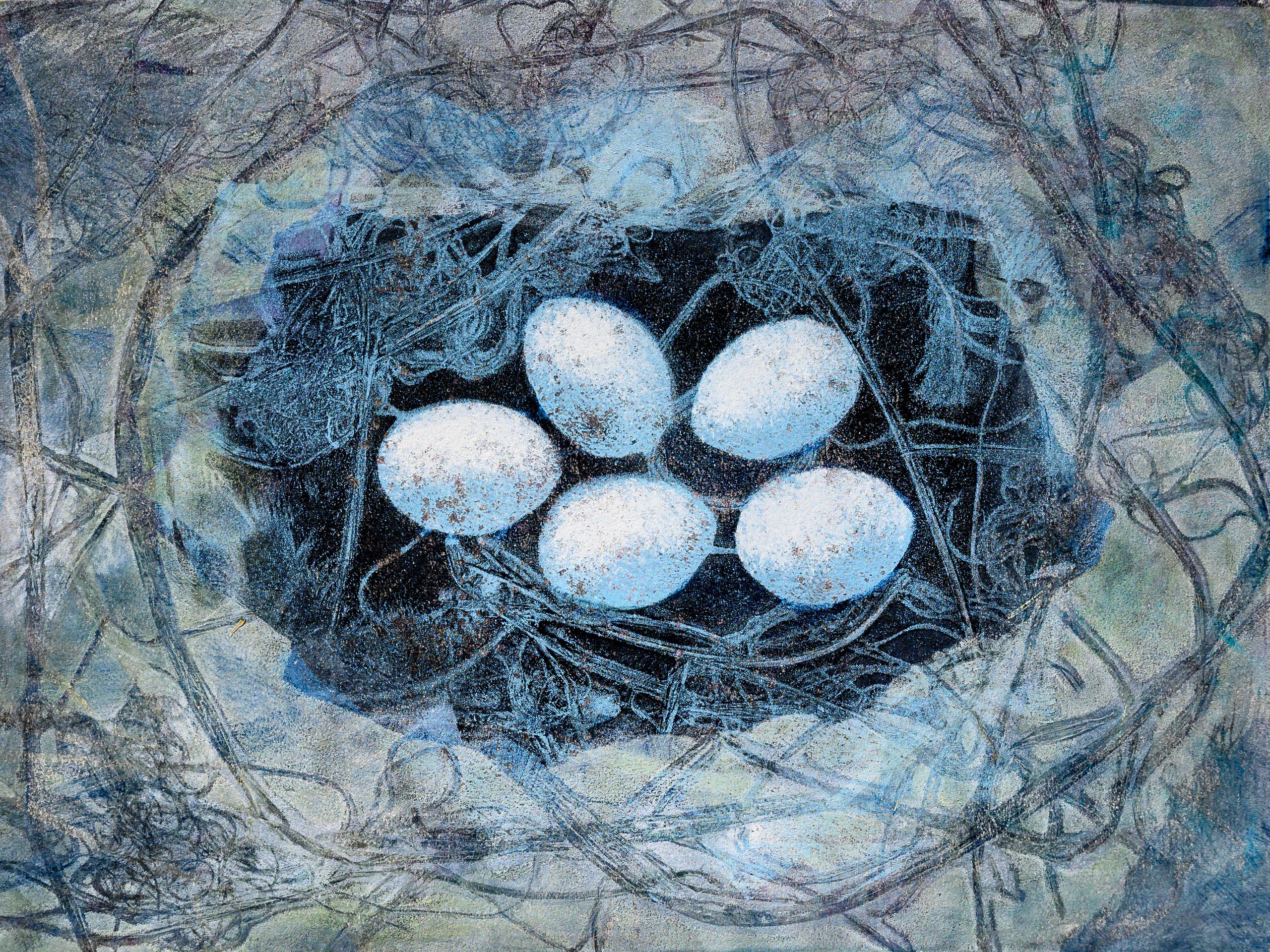 Vogelnest met eieren op A3 papier, afbeelding iets groter dan A4. Origineel werk, ook beschikbaar als print, zie link