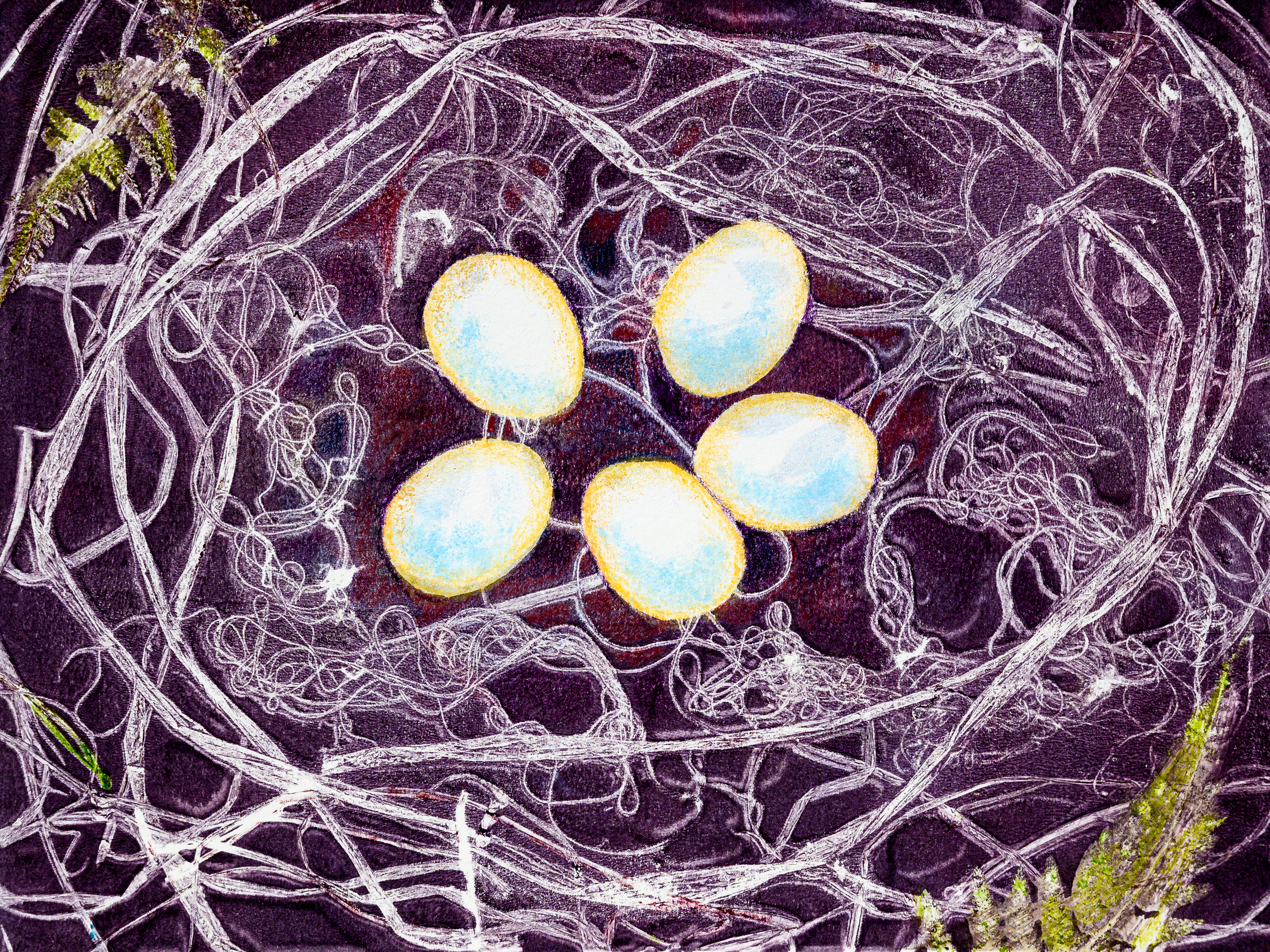 Werk op A3 papier, afbeelding iets groter dan A4. Vogelnest met eieren, het broedseizoen is begonnen.