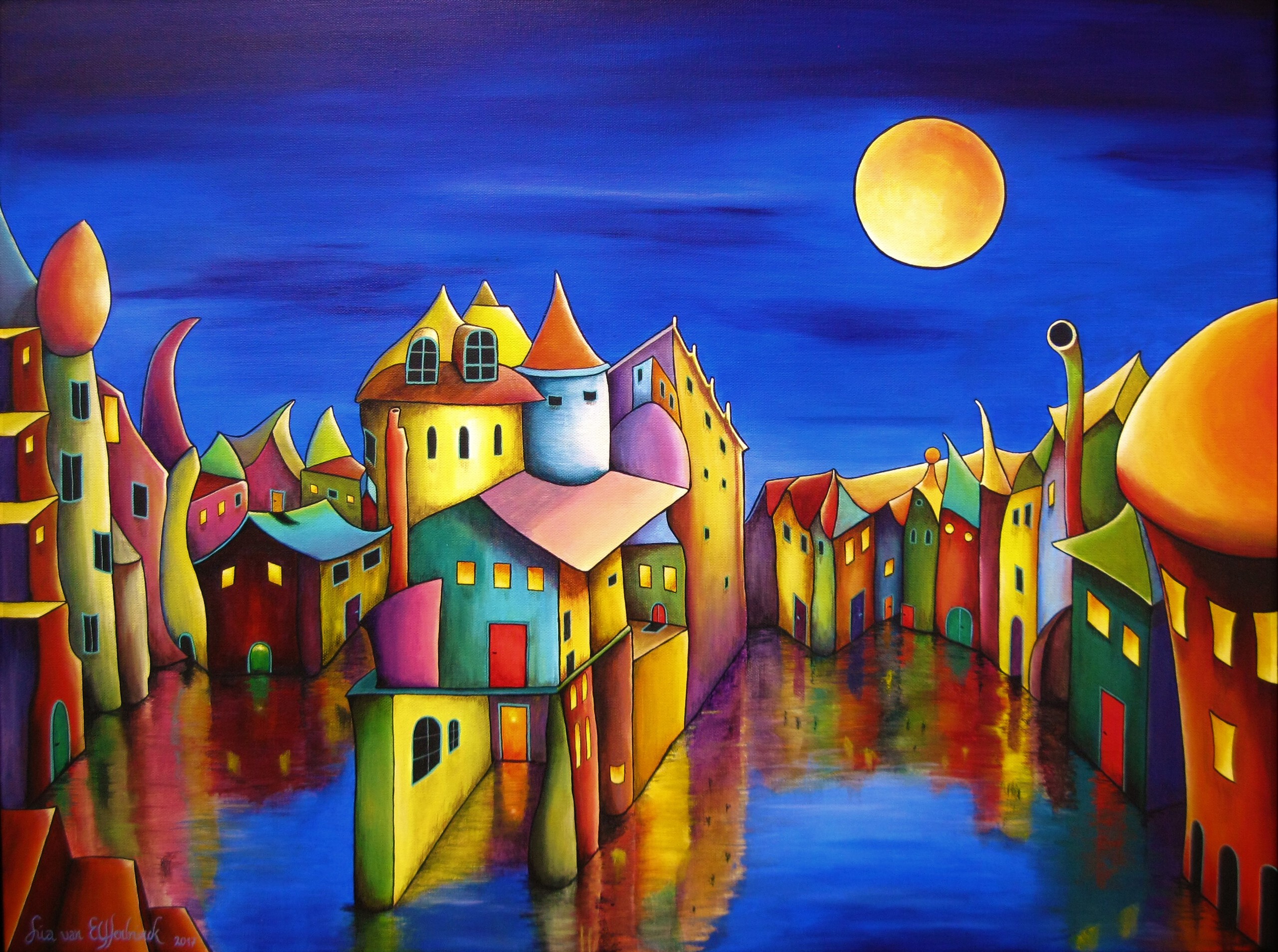 Stad Schilderij Dorp Stadje Bontgekleurd Kleurrijk Blauw Maan Daken Huizen Gebouwen Water Spiegeling Reflectie Torens Koepels Lijnenspel Abstract Semi-abstract Deuren Ramen Licht