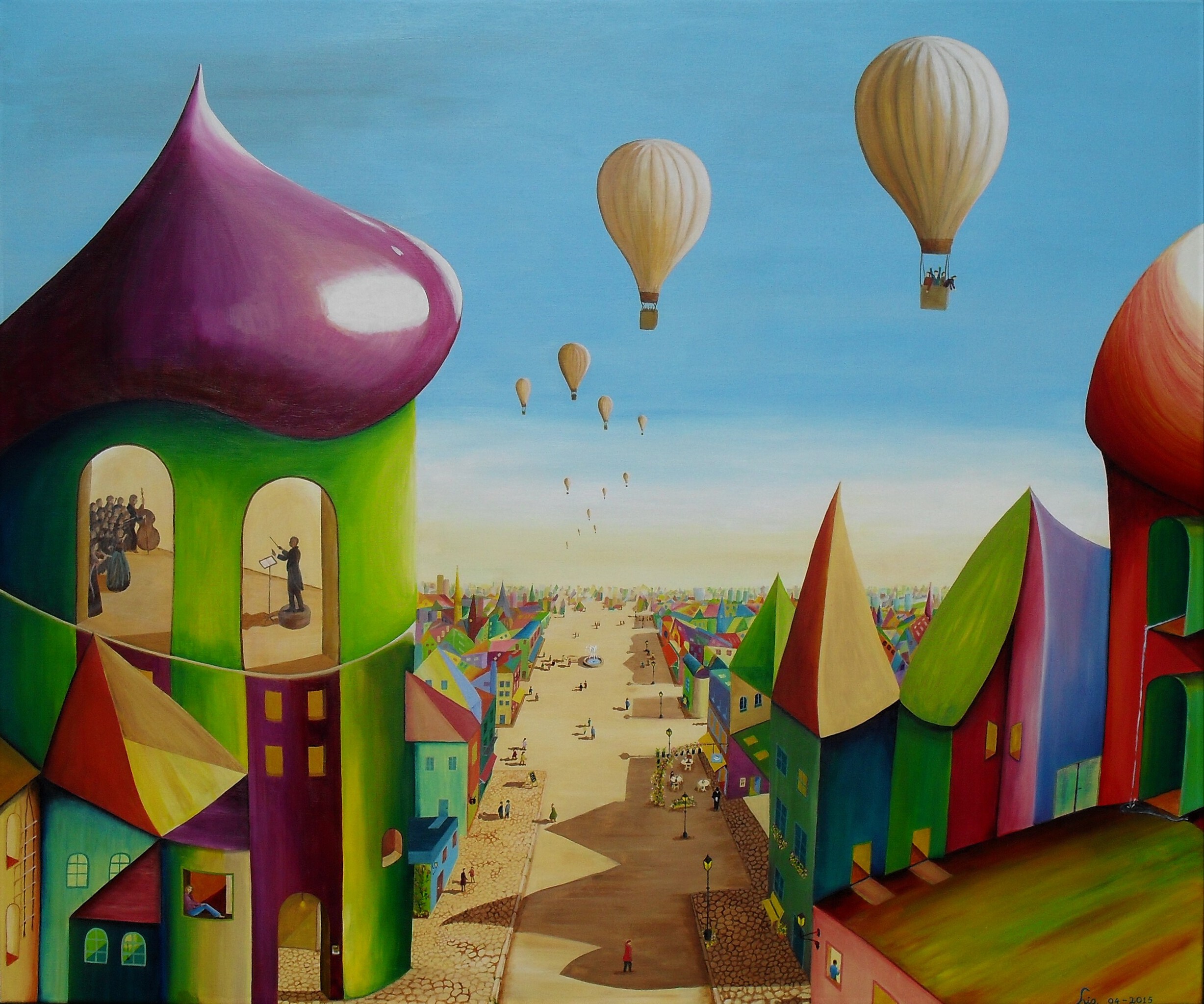 Ik wilde iets vredigs schilderen om naar te kijken zonder je te vervelen. Schilderij van een kleurrijke fantasiestad in het daglicht. Luchtballonnen in de blauwe lucht, een brede okerkleurige weg in het midden tot aan de horizon, huizen in alle kleuren en vormen, aan de voorkant een ronde toren met ramen waar je Richard Wagner als regisseur ziet.
