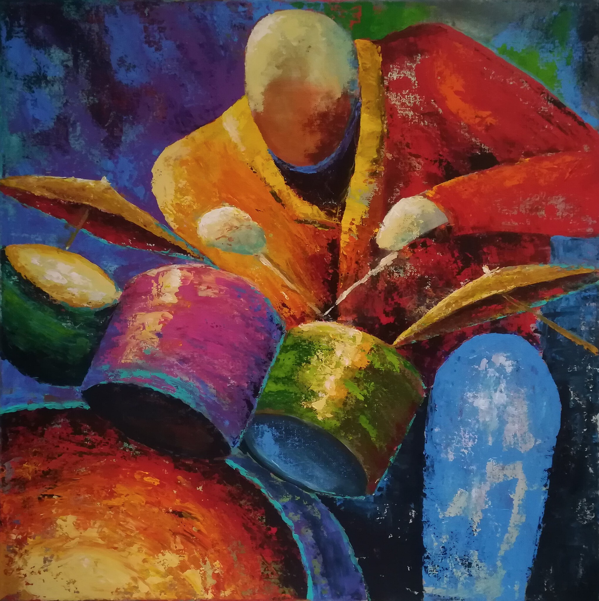 Als drummer speelde mijn zoon graag het nummer: "Rhythm of Life". Ik had hem en Buddy Rich in gedachten toen ik aan dit schilderij werkte. Dit werk is geschilderd met het paletmes.