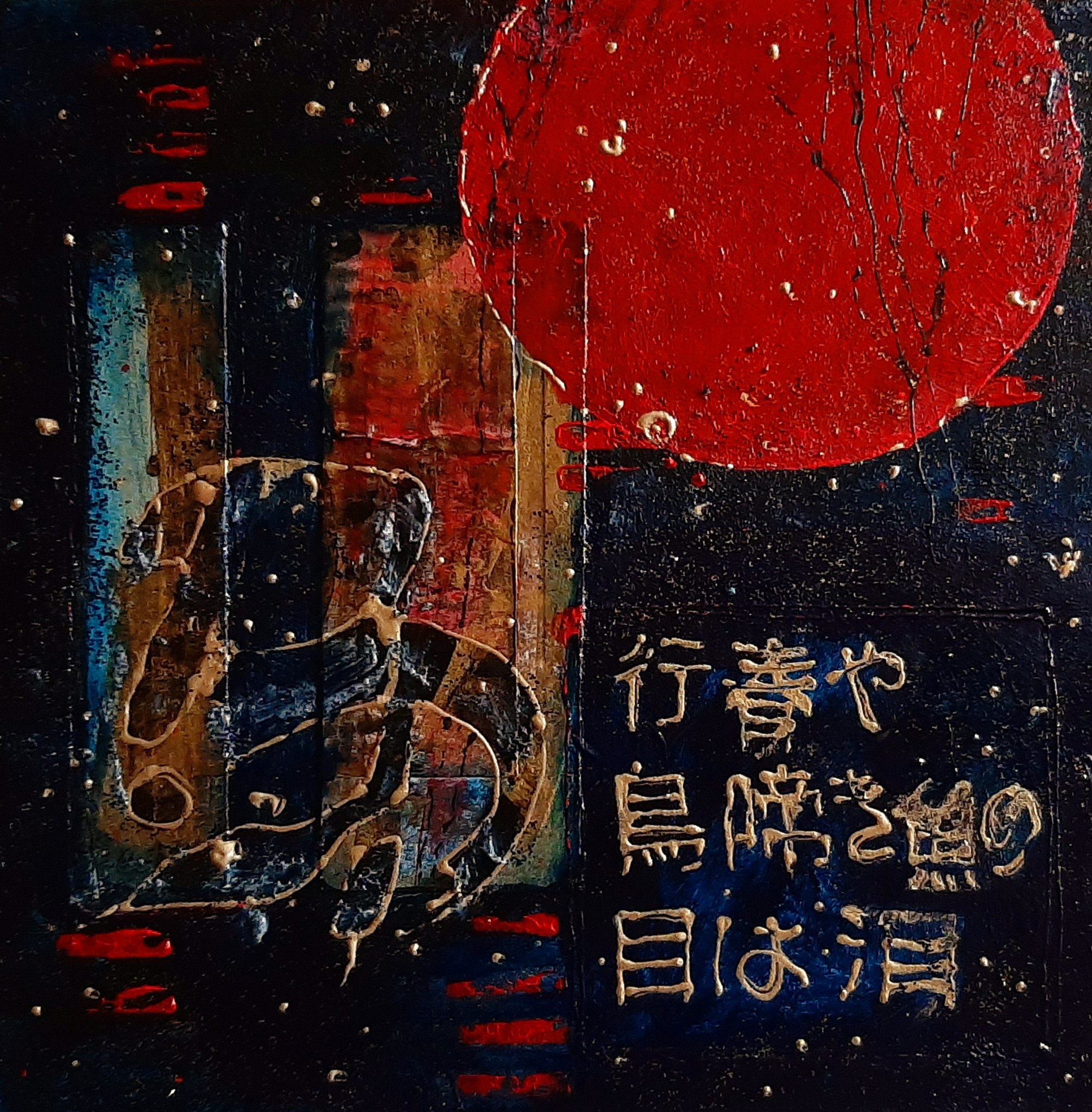 In de reeks Japanse calligrafieën heb ik een aantal Haiku's van de Japanse dichter Matsuo Basho vormgegeven. Dit is de tweede. Op stevig dik karton. 旅に病んで 夢は枯野を かけ廻る [Tabi ni yande/ Yume wa kareno wo/ Kakemeguru] Sicking on journey, My dream run about A desolate field