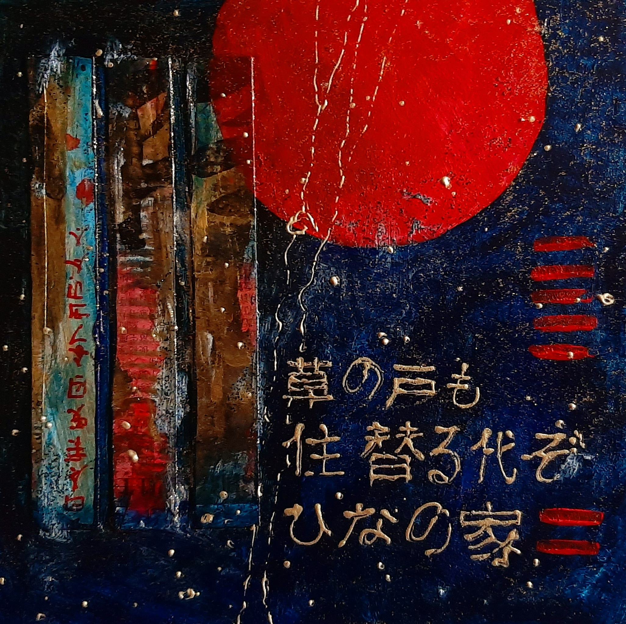 In de reeks Japanse calligrafieën heb ik een aantal Haiku's van de Japanse dichter Matsuo Basho vormgegeven. Dit is de derde. Op stevig dik karton. 草の戸も 住替る代ぞ ひなの家 [Kusa no to mo/ Sumikawaru yo zo/ Hina no ie] The owner of the old thatched hut Has been also another It’s the Doll’s Festival