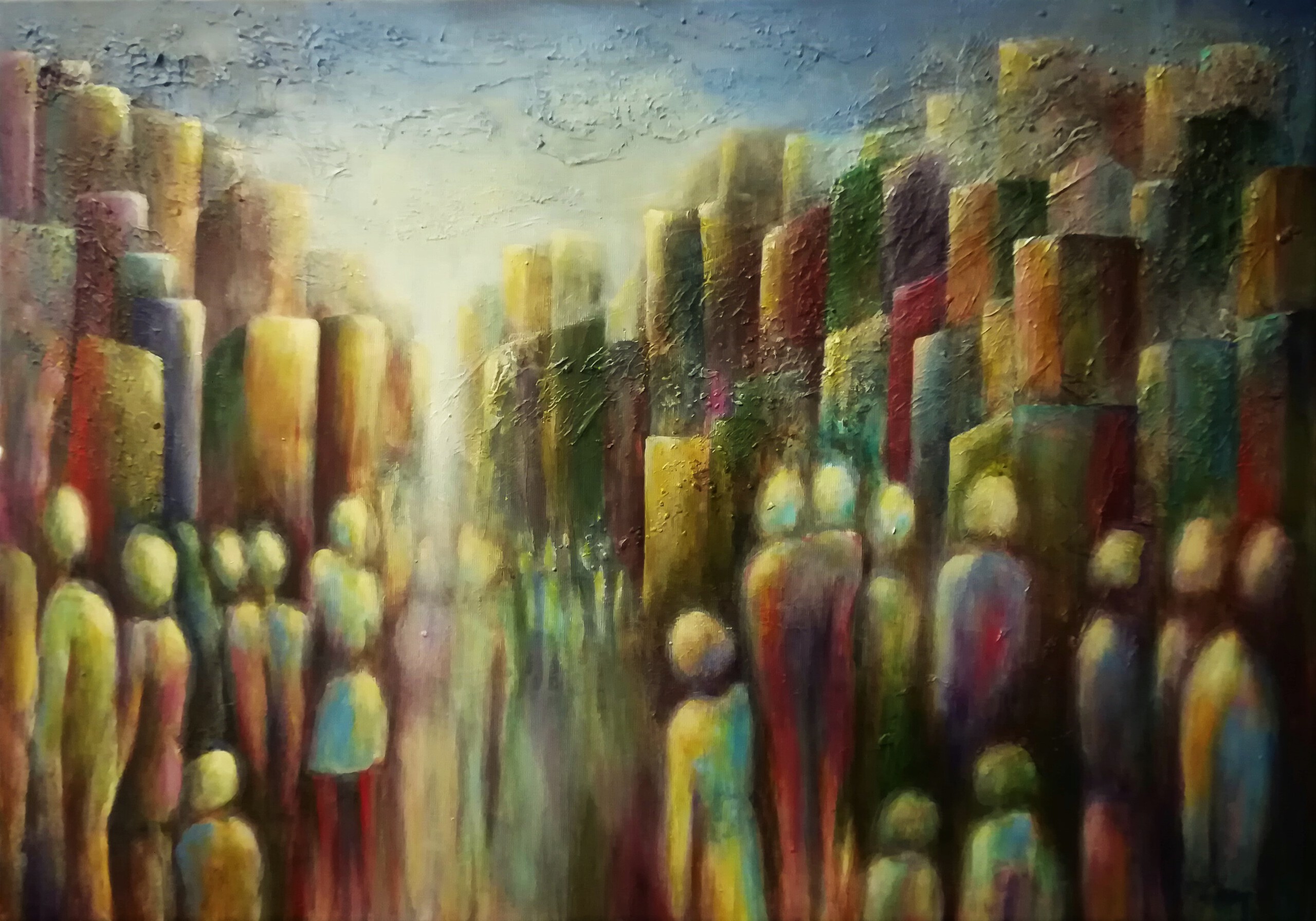 Stad Ontmoeten Drukte Mensen Abstract Ontmoeting Kleurrijk Schilderij Gekleurd Bontgekleurd Spiritueel Antroposofisch Antroposofie Zaterdagmiddag Druk Bezig Tempo
