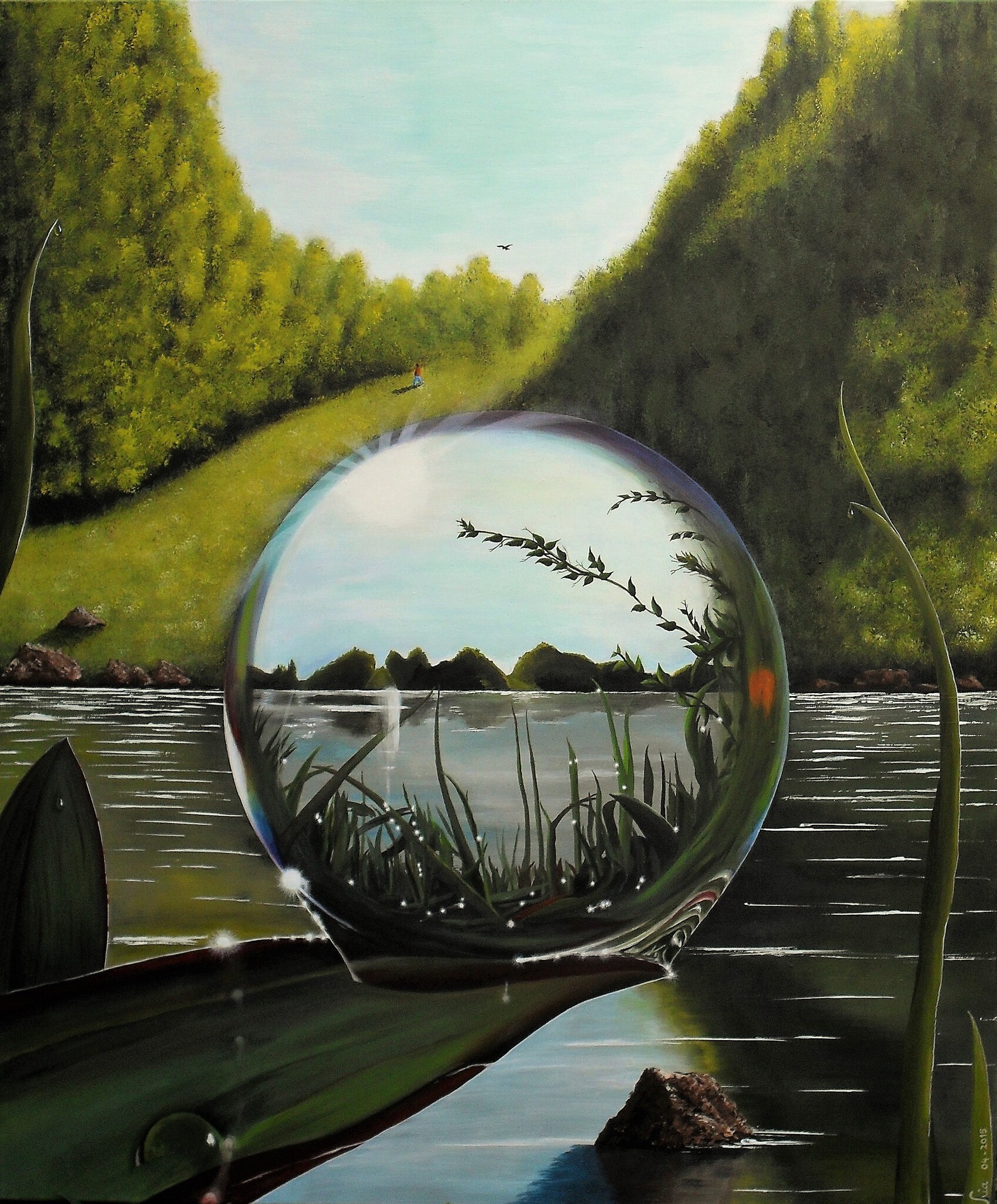 Waterdruppel Landschap Druppel Spiegeling Reflectie Bos Rivier Meer Meertje Blad Water Wateroppervlak Rotsen Stenen Bossen Struiken Waterbol