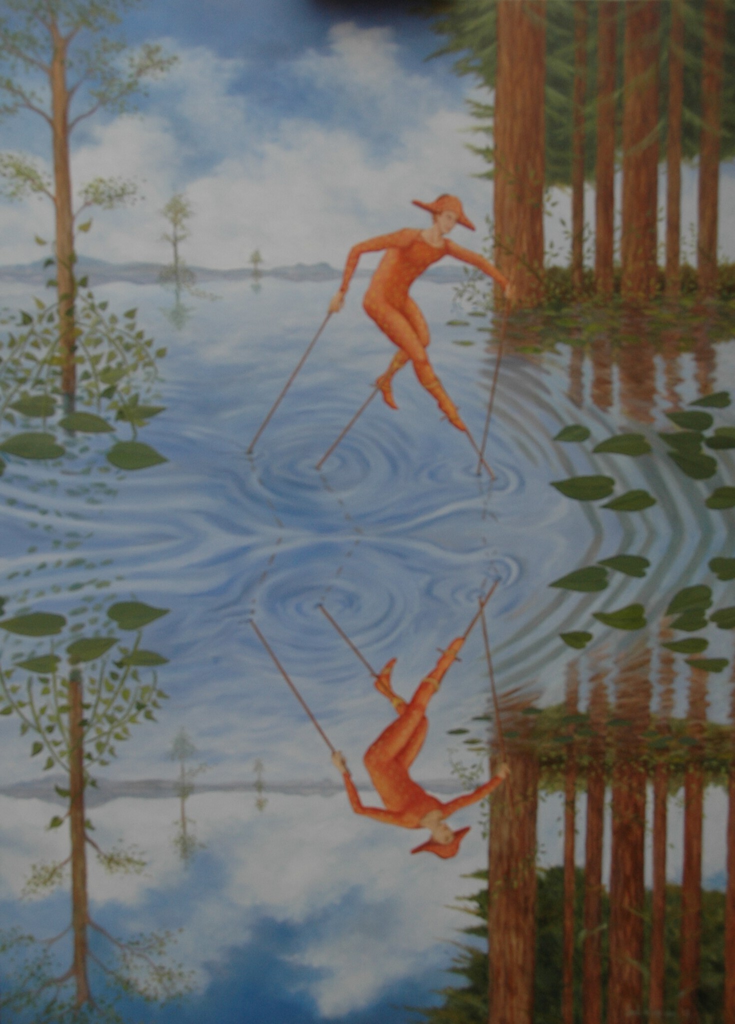Na het ontwerpen van een steltloper, ontstond het idee om het hele schilderij te spiegelen.