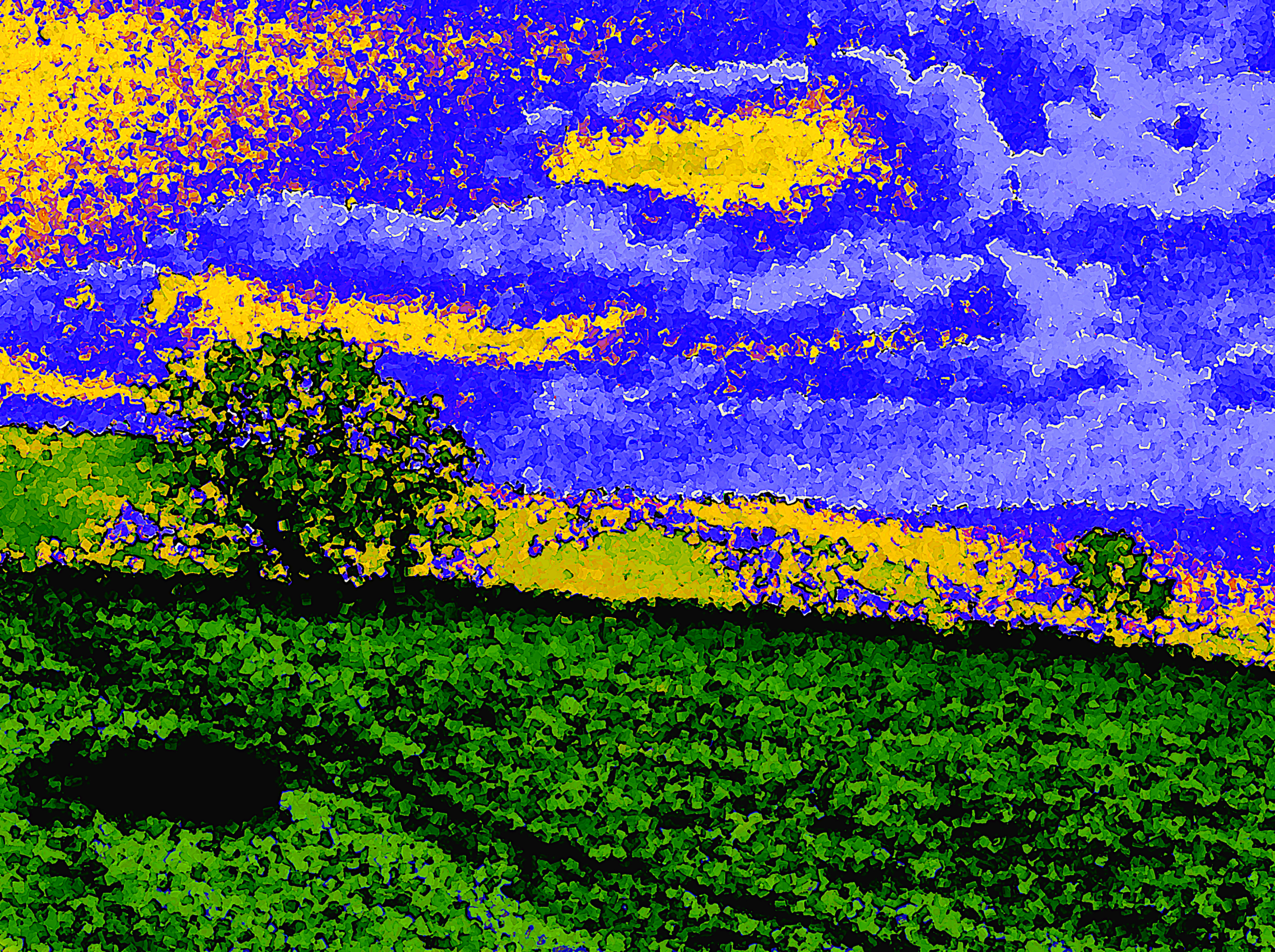 Beeld van een Frans landschap. De bron van dit werk is een door mij gemaakte 35mm zwart-wit negatief opname van een landschap in de Auvergne, Massief Centraal. Het gescande negatief is met behulp van verschillende digitale technieken zodanig bewerkt dat het op een expressionistisch schilderij lijkt, waar Van Gogh zojuist uit het beeld zou kunnen zijn gelopen. Attentie: het werk wordt ingelijst geleverd. Zie voor meer info de pagina Levering.