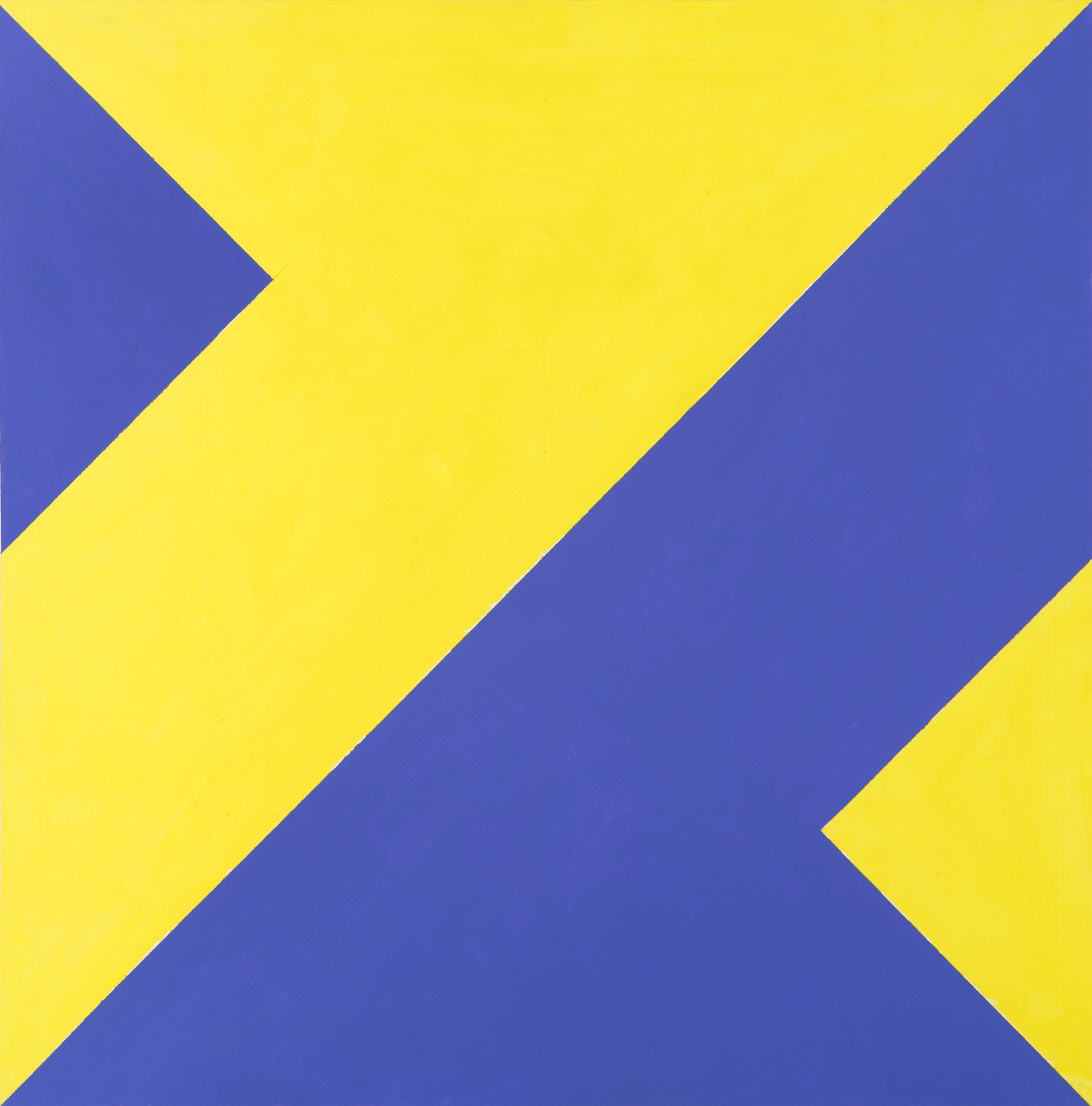 'Tweedeling kwadraat in geel-paars' - kleurige geometrisch-abstracte schilderkunst; schilderij in acrylverf op board.