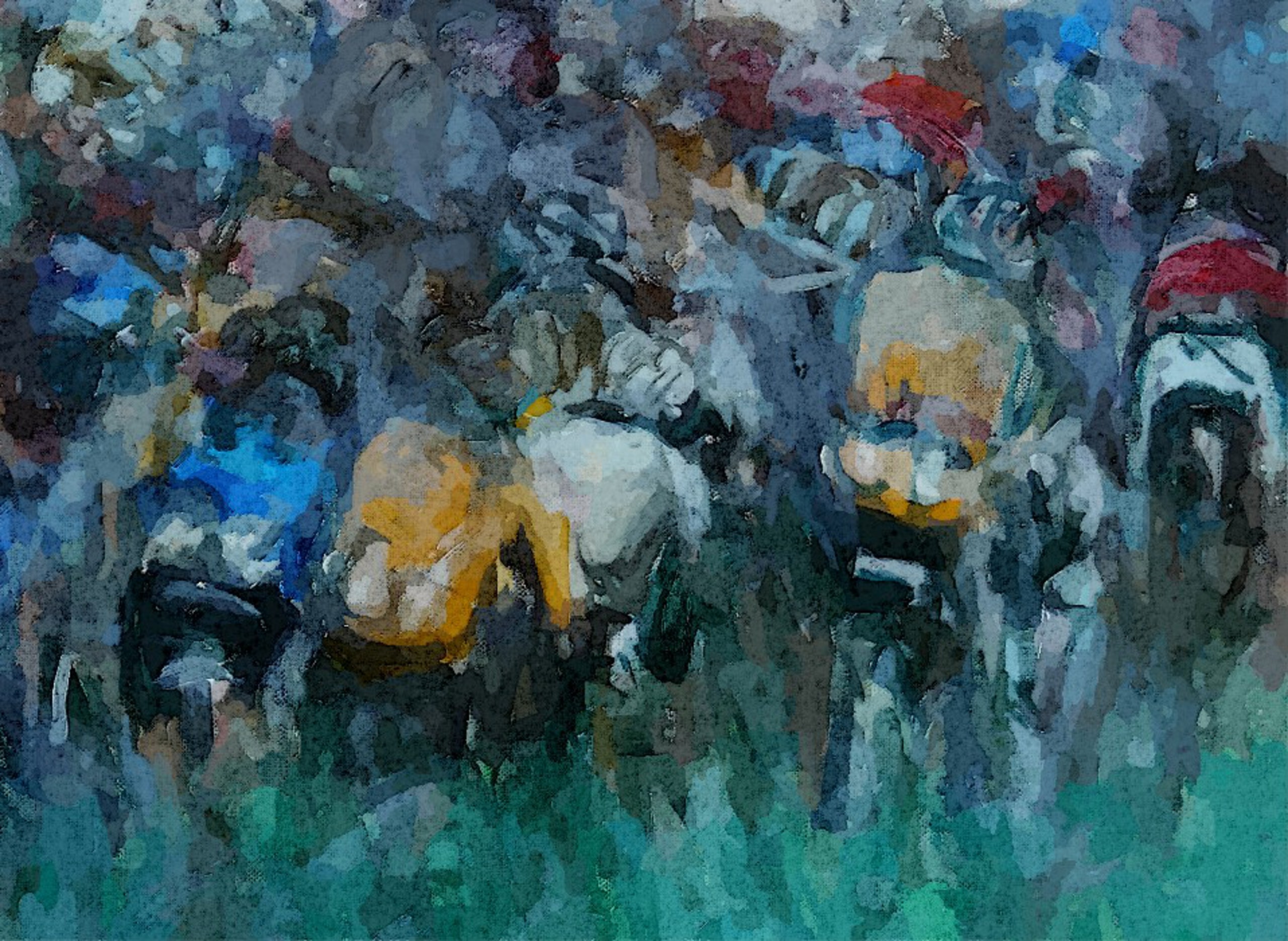 impressionistisch aquarel met wielrenners die positie kiezen in het wielerpeloton het wielerspektakel wordt door de manier van schilderen weergegeven