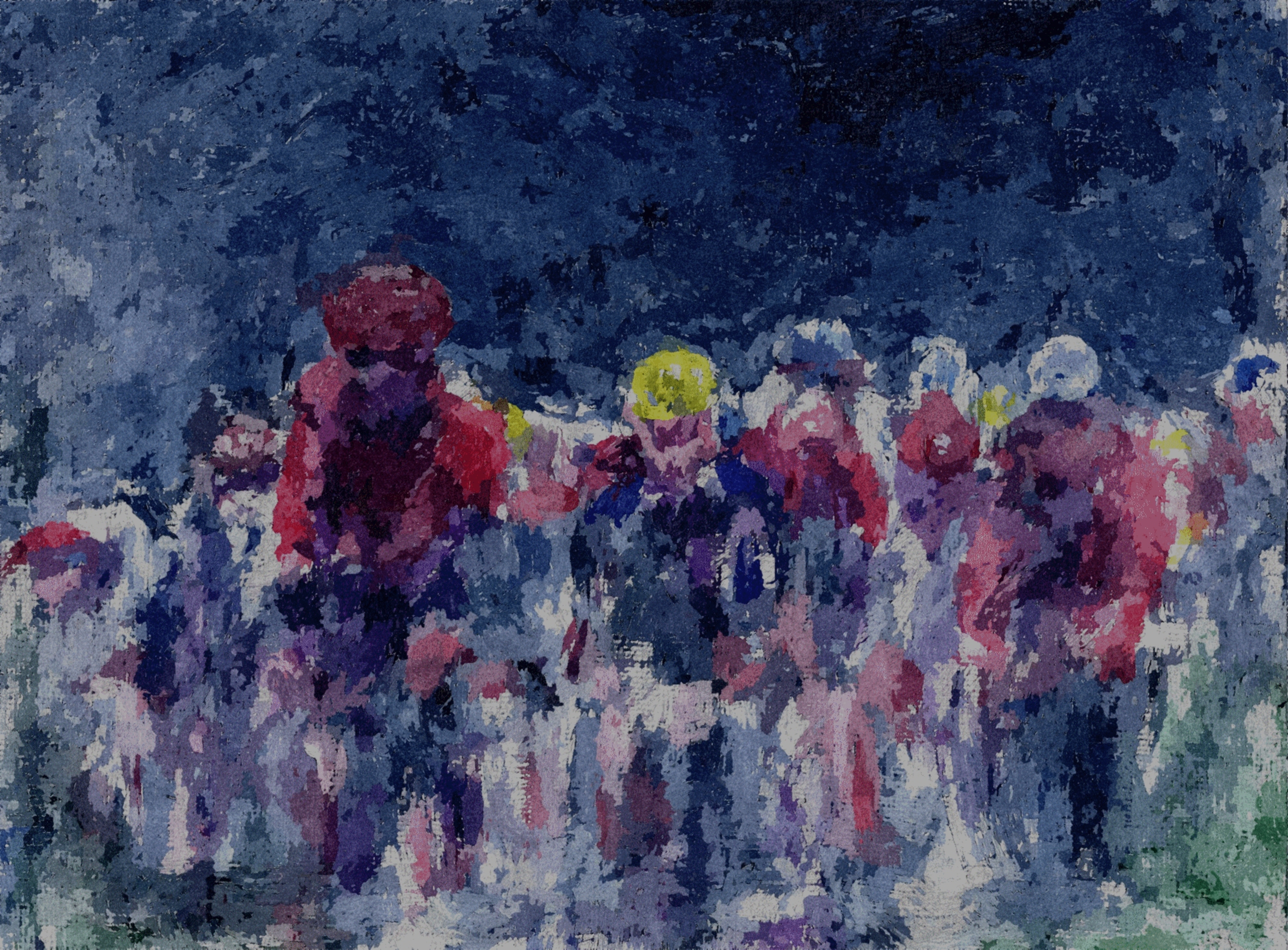 kleuren van het wielerpeloton die voortdurend lijken te veranderen dit komt door de bewegingen, het licht valt steeds anders weergegeven door de snelle toetsen van het aquarel met het penseel