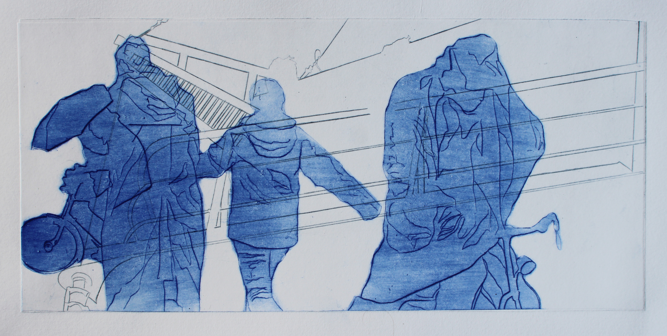 Maaike H. Schenk maakt tekeningen maar vooral grafiek, etsen. Haar werk bestaat uit fragmenten van alledaagse dingen, gerangschikt totdat er een eigen orde en ritme ontstaat. Mensen in hun leefomgeving zoals de chaos en drukte van de stad, een luide parade, de stille natuur, een begroeting, zijn aanleiding voor verhalend werk. De figuratieve elementen in lijn, gaan met abstracte vormen in dialoog, worden naast elkaar geplaatst als contrast of juist samengevoegd in een zingevend verband. Maaike gebruikt herhaling en tegenstellingen met verwondering over het moment als leidraad.