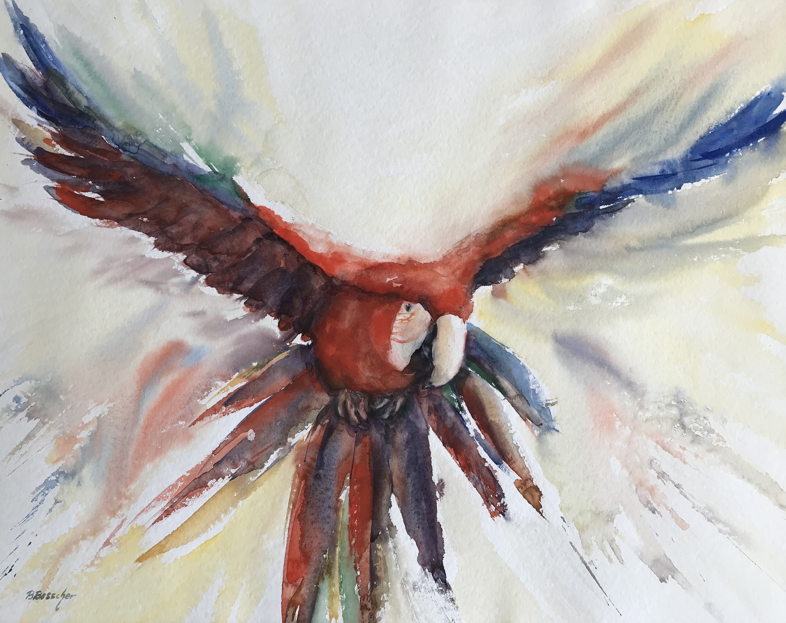 De felle kleuren van de papagaai gevangen in de beweging. Het werk zit in passe-partout en in een aluminium wissellijst van 60-80 cm