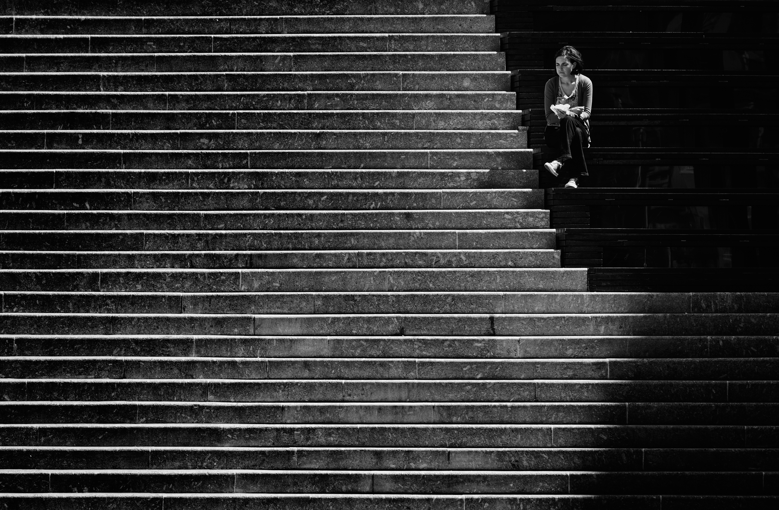 Trap Lunchen Herhaling Schaduw Zwart Wit Vrouw Pauze