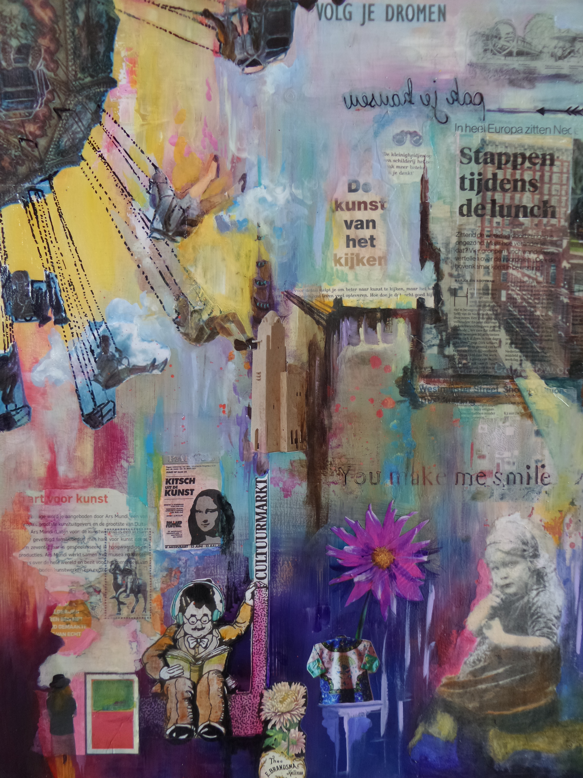Collage met verschillende materialen en technieken ...met in de hoofdrol een zweefmolen en de kunst van het kijken....het heeft een beetje een nostalgisch tintje...in zachte kleuren..