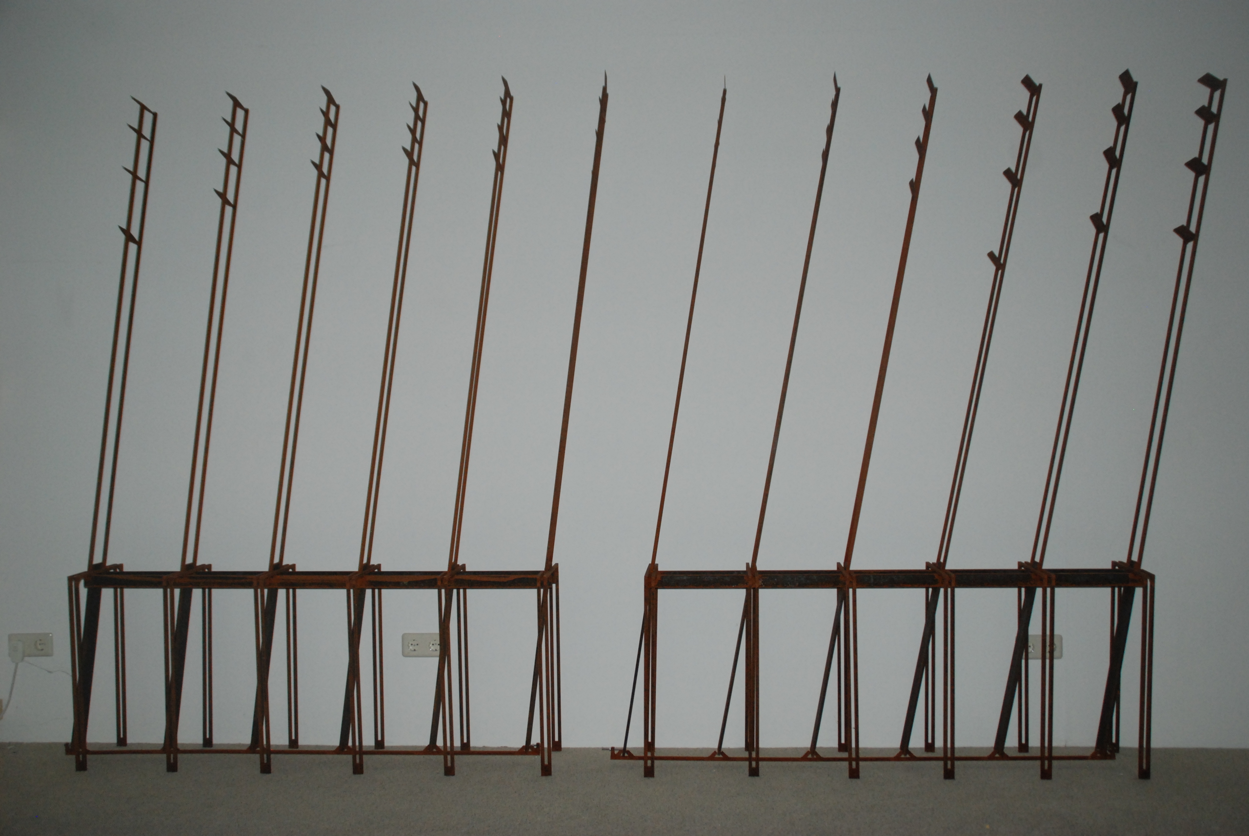 doordat elk staand onderdeel flexibel is opgesteld kan beweging door de wind ontstaan. Dan moet het wel buiten staan: en dat kan. Bovenin de bewegende delen is een golflijn te zien.