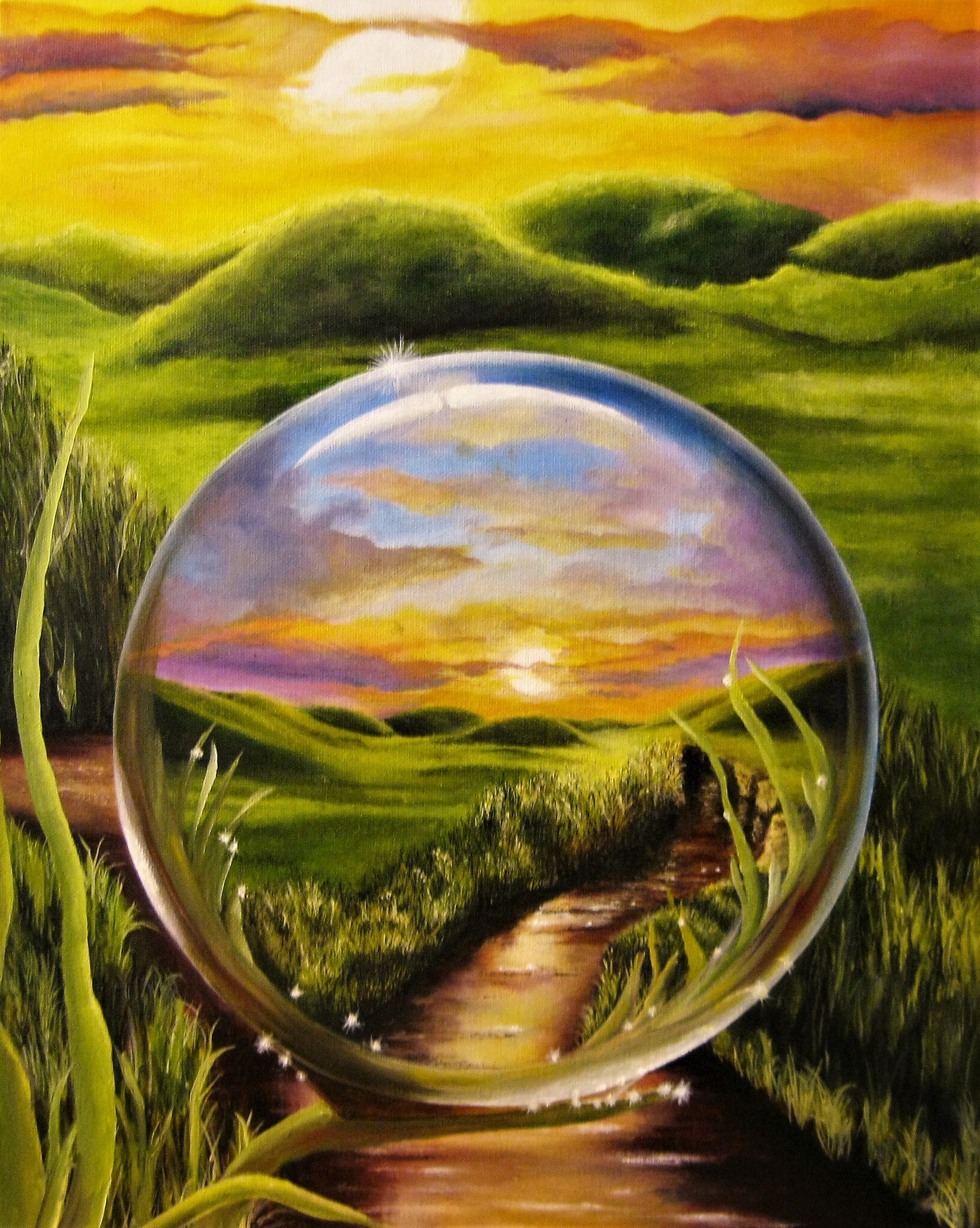 Schilderij van een landschap gereflecteerd in een waterdruppel. Het landschap doet me een beetje denken aan de Teletubbies, een programma op de televisie in de jaren 90. Op de achtergrond ziet u de zonsondergang.