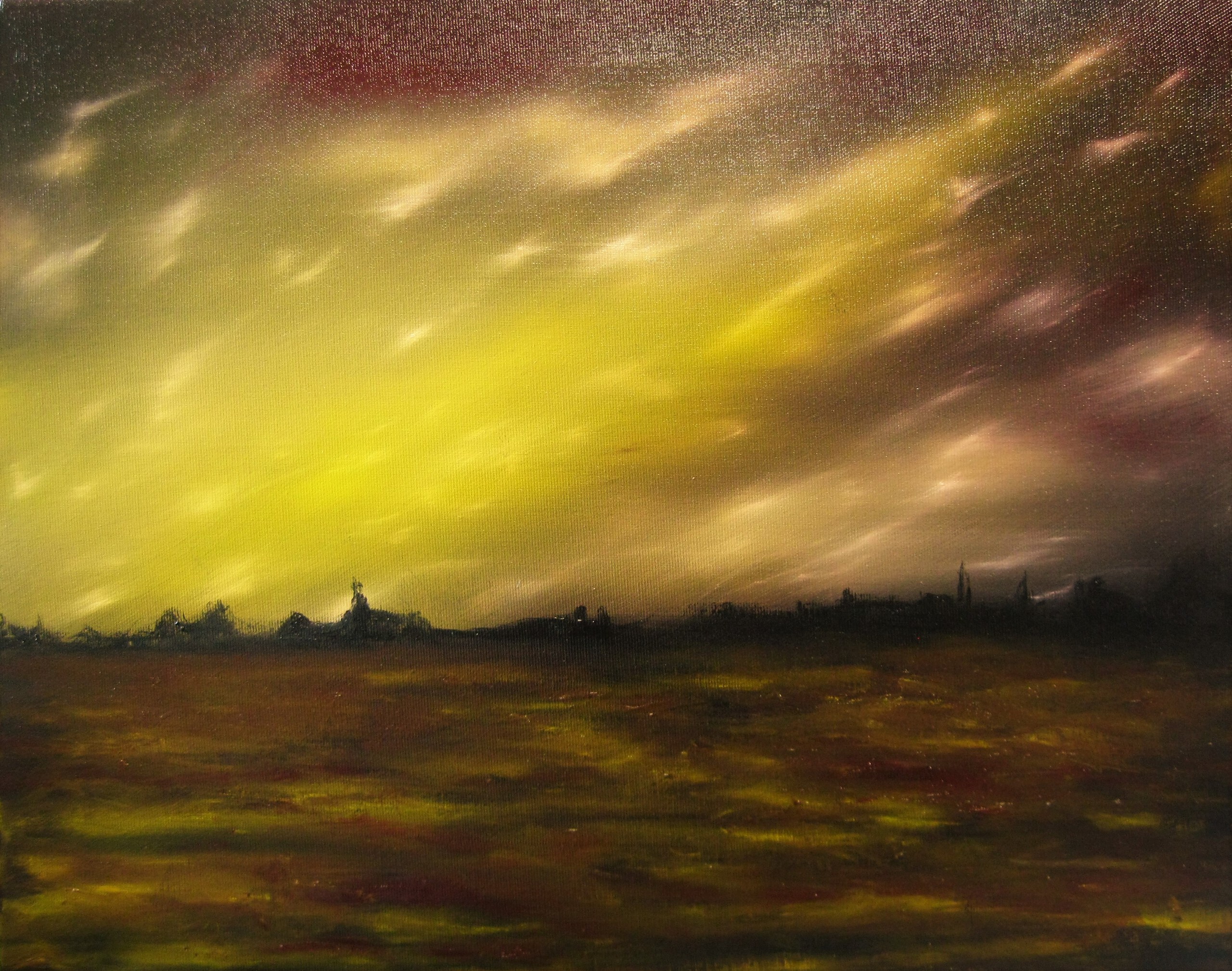 Schilderij van een klein dorpje in de verte. Iemand zei: "aan de hemel zie je meteorieten die dit schilderij een surrealistisch effect geven". Terwijl ik dit werk schilderde, dacht ik aan de omgeving waar mijn grootouders opgroeiden. Het moet er zo hebben uitgezien.