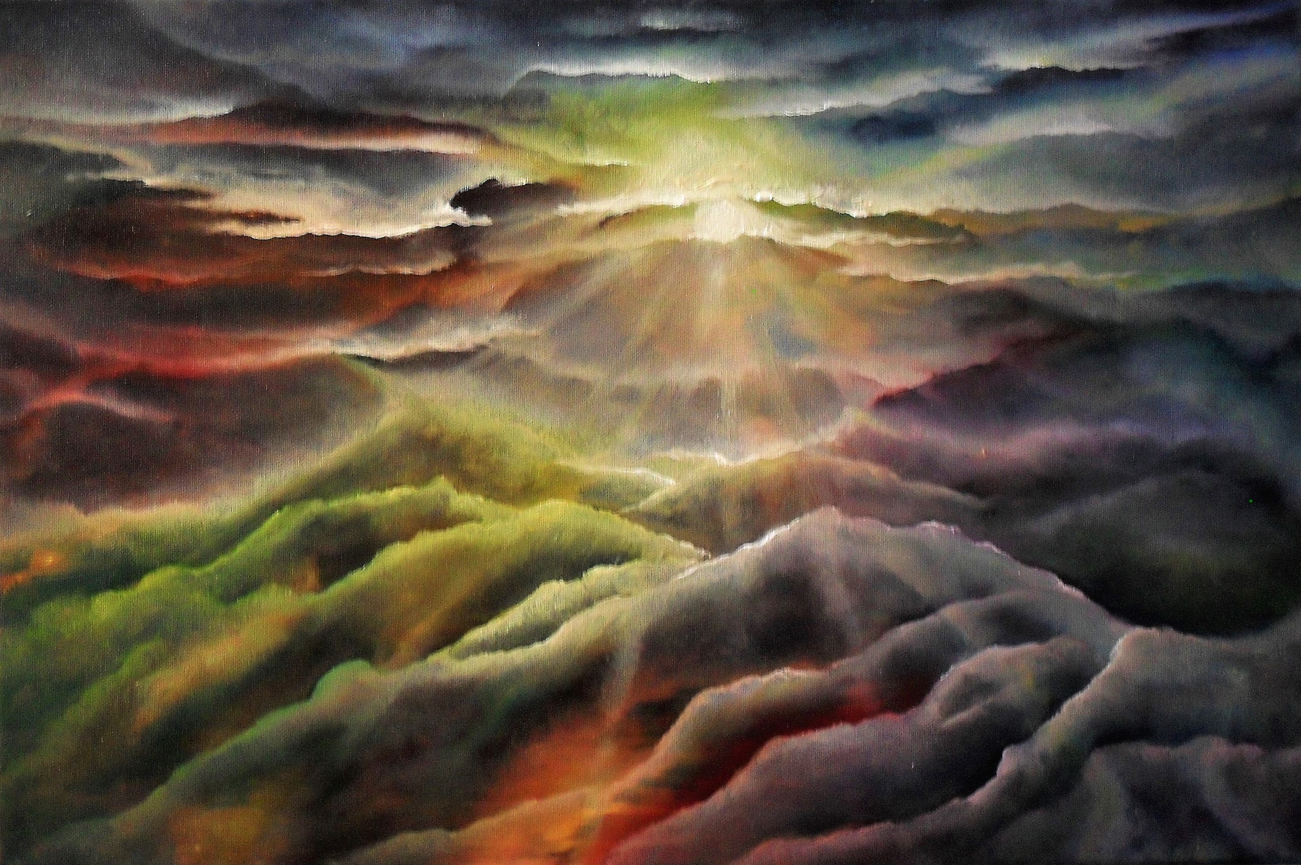 Dat dacht ik toen ik voor het eerst in mijn leven in een vliegtuig zat. De wolken en bergen zagen eruit alsof ze samen waren gegroeid, zodat je op de wolken kon lopen. Ik moest deze zeer grote ervaring schilderen. Ik wilde dat mijn grootvader een keer zou vliegen, maar hij durfde het niet te proberen.