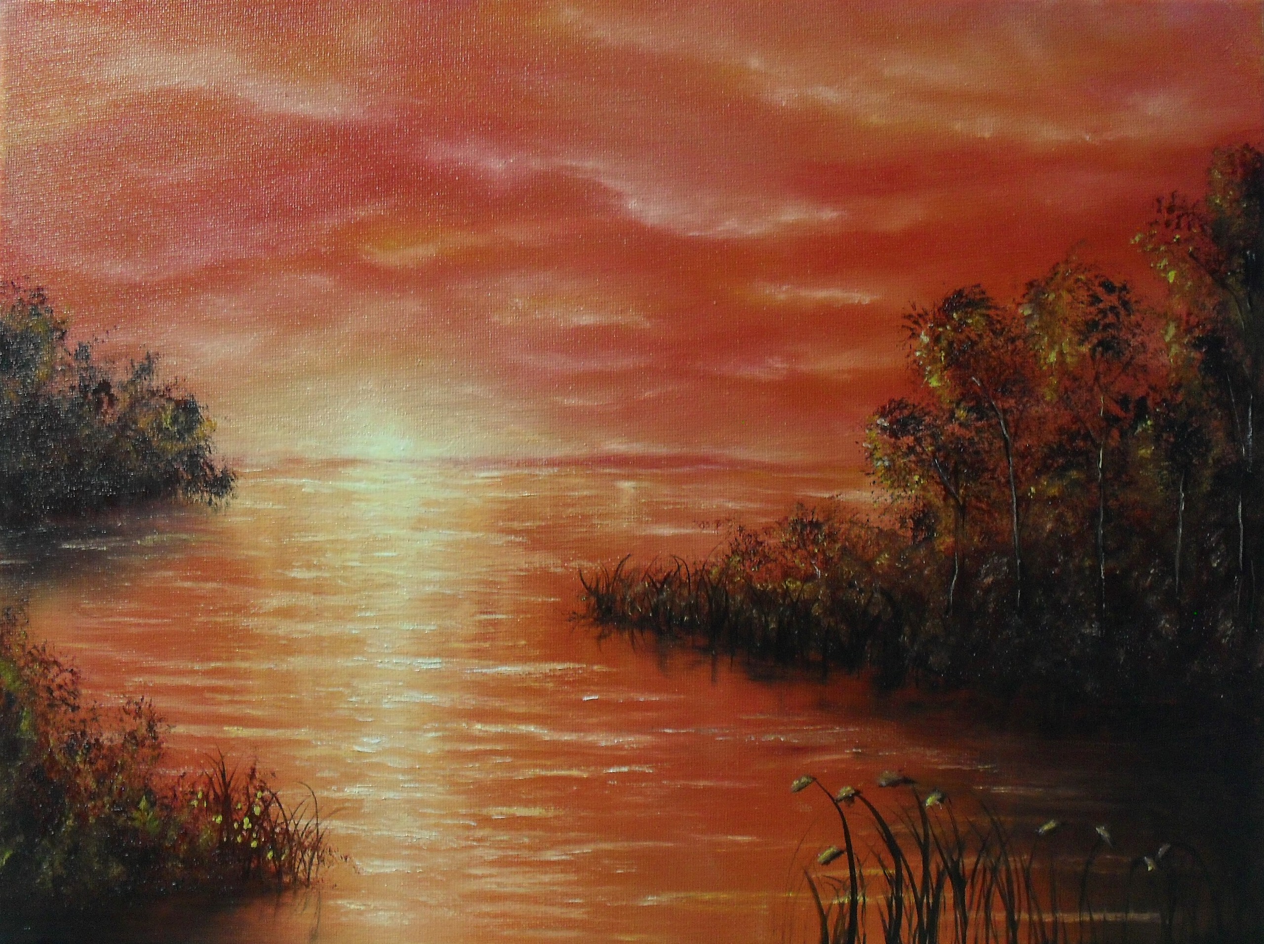 Zonsondergang Zonlicht Licht Meer Weerspiegeling Waterspiegeling Reflecties Avond Nacht Bosjes Bomen Horizon Lucht Wolken Kleurrijk Gekleurd Avondlicht Zwart Canvas Gras Wollegras Maan Maanlicht Moeras