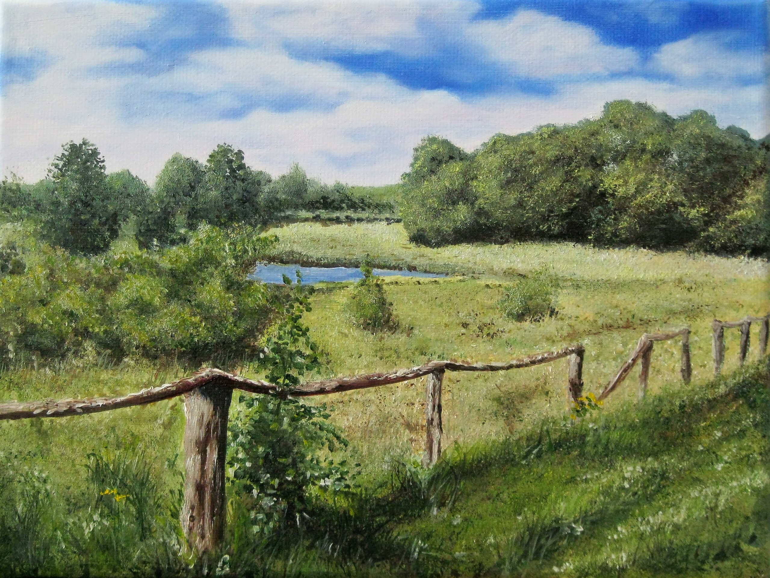 Dit landschap heb ik geschilderd voor een vriendin. Ze woont in Noord-Duitsland en wandelt het liefst in dit gebied. Ze heeft een foto genomen van precies deze plek, zodat ik het kon schilderen. Links is de foto te zien en rechts het schilderij, genoemd: “Resource”.