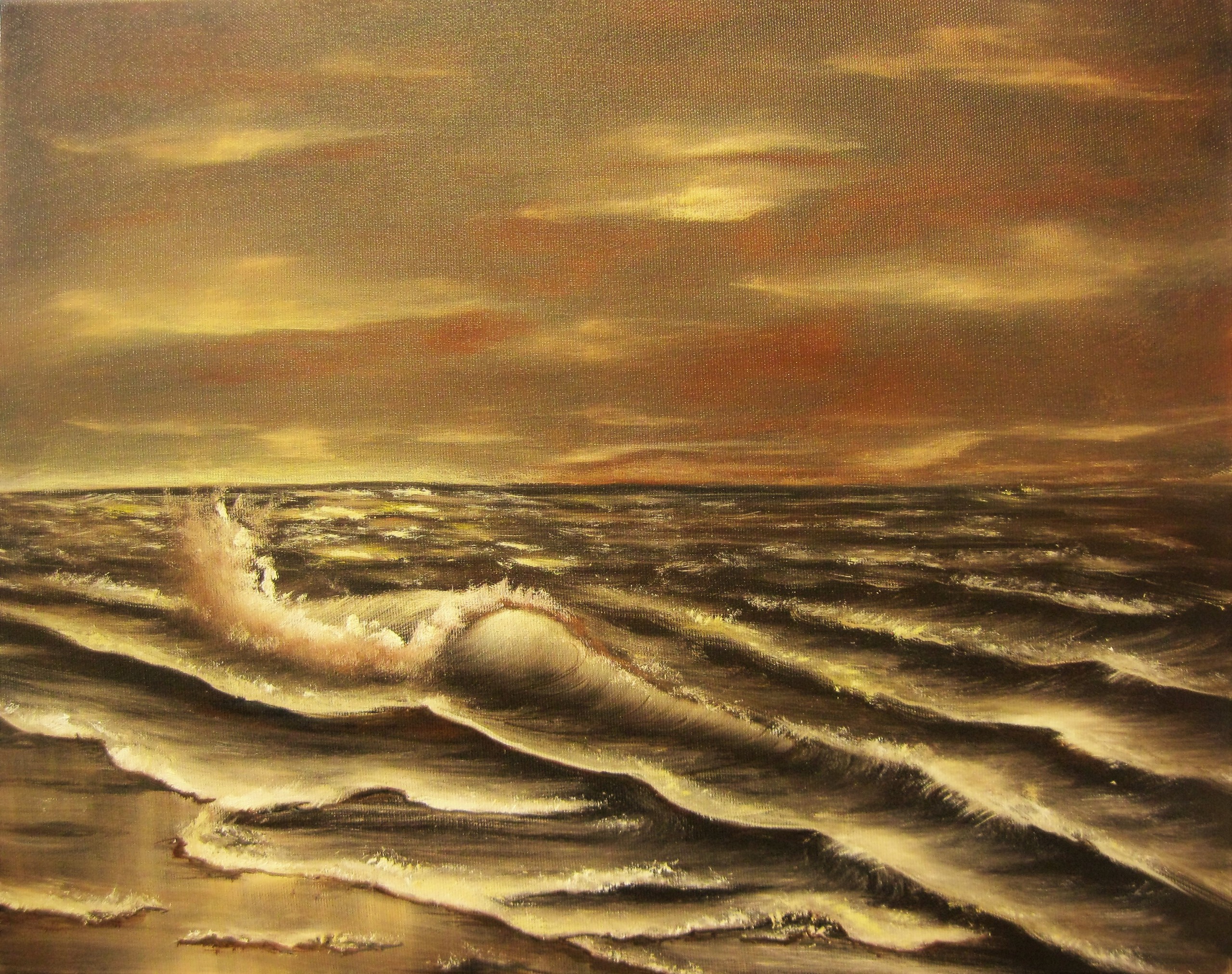 Je ziet het water en het zand in de kleuren bruin, beige en oker. De zon is net ondergegaan, dus het licht is schemering. Het geeft me een speciaal gevoel om in de schemering op het zand aan een oever te lopen.