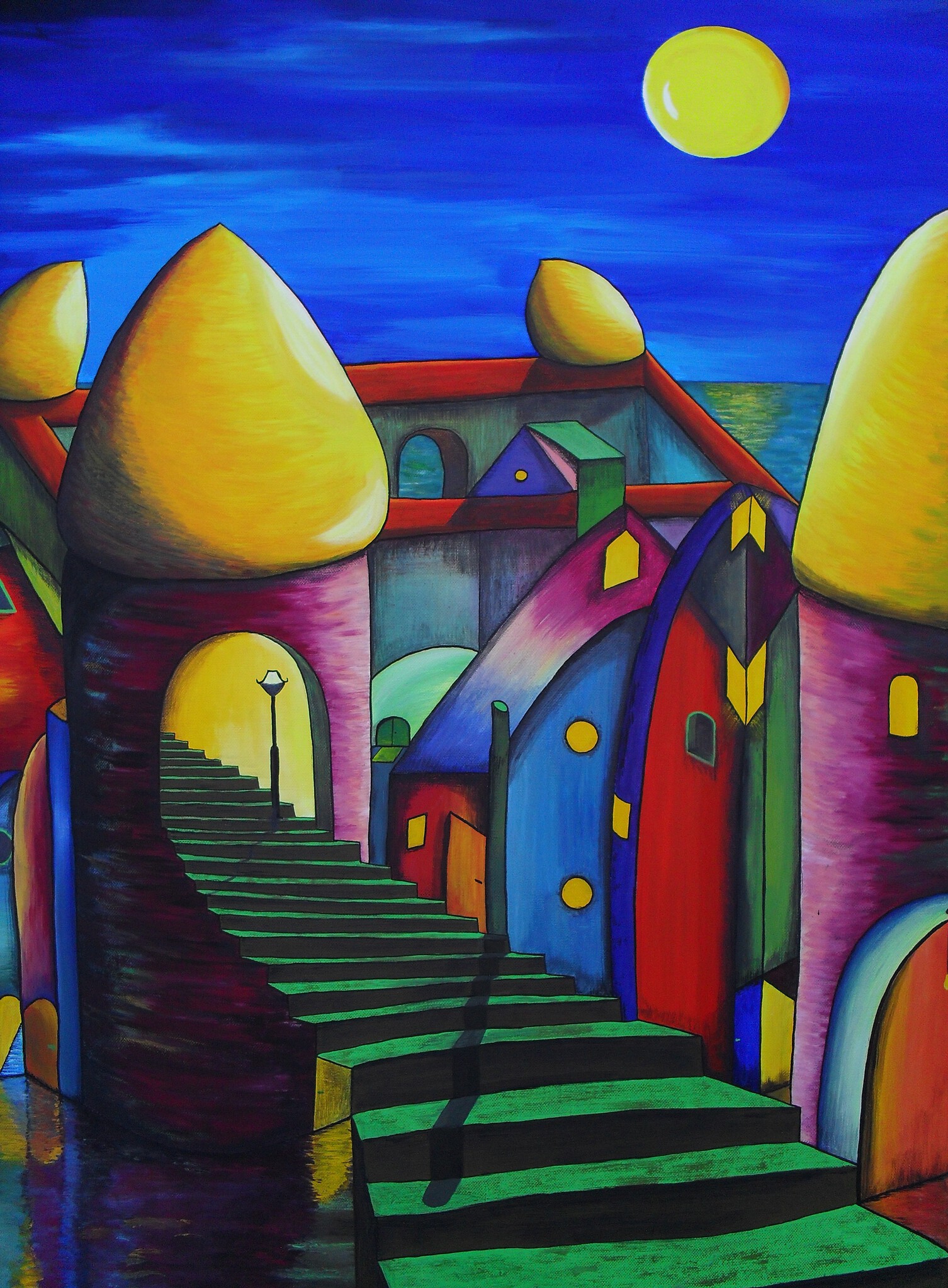 Stad Toren Torens Gebouwen Bouwwerk Gekleurd Kleurrijk Trap Krom Muren Daken Ramen Water Lucht Maan Zon