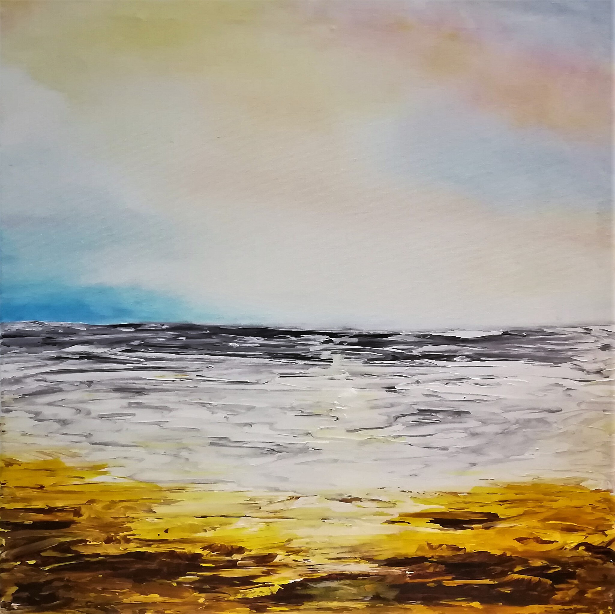 Ik schilderde dit werk alleen met inkt en gesso op canvas. Het schilderij kreeg zijn textuur van de gesso. Ik word blij van het werken met de felle kleuren en de inkt.