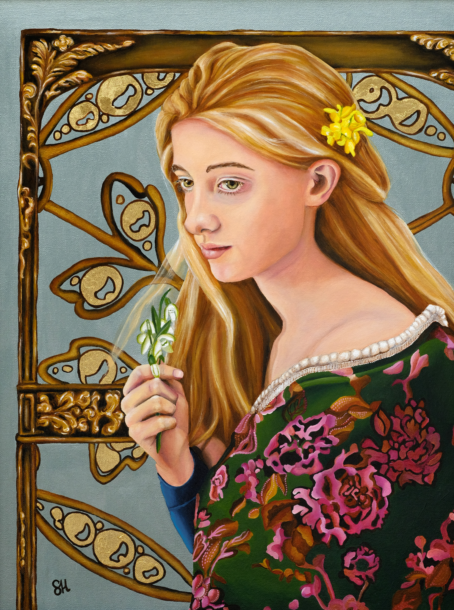 Romantiek Goud Bloemen Portret Art Romantisch Lente Koninklijk Nouveau Historisch Kleding Metallic Sneeuwklokjes Gevoelig Stofuitdrukking Pre-raphaelieten