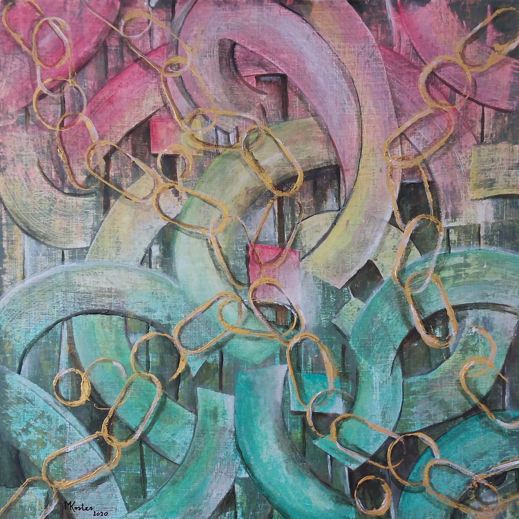 Ontstaan in de tijd van het coronavirus. De C' s staan voor Corona. De ketens voor vast zitten aan regels en aan huis. Verbonden door gouden schakels. We voelen ons meer verbonden dan ooit. Compleet met zwarte of witte baklijst.