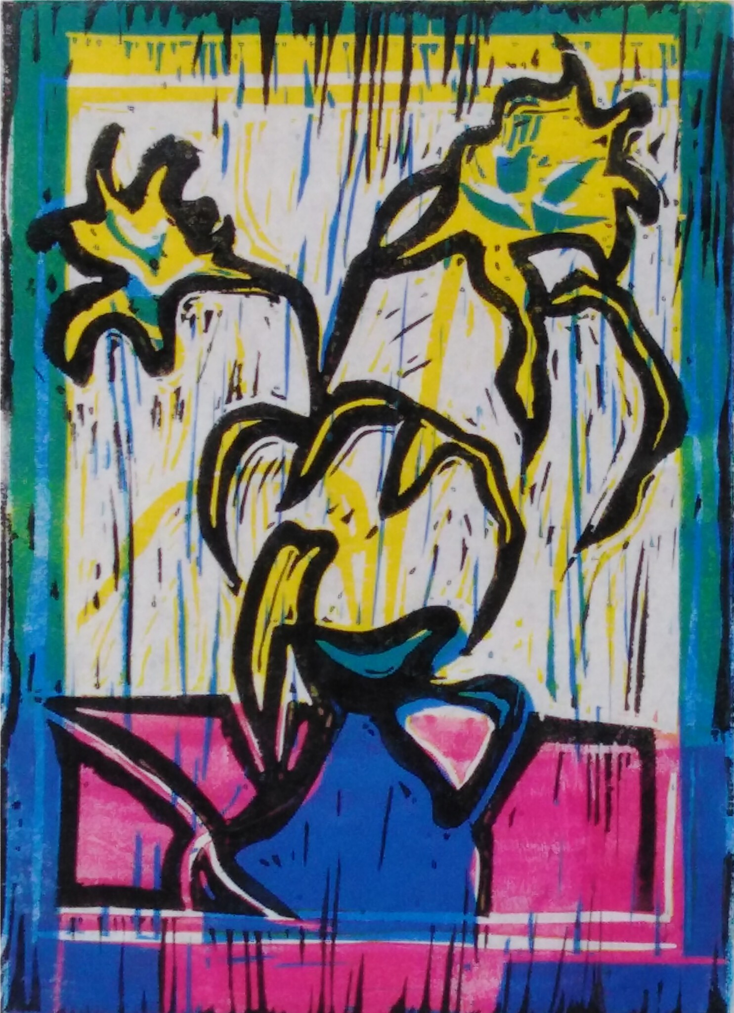 Good old fashioned linosnede. Interpretatie van eigen oude tekening naar waarneming. (4-kleurendruk)
