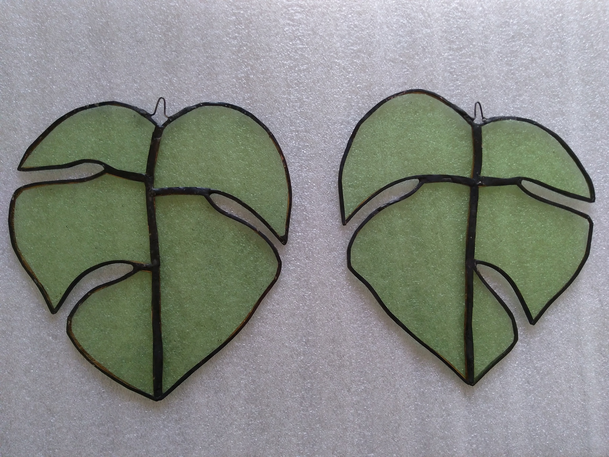 Monsterablad is grillig en geeft daardoor ruimte aan de maker. Deze bladeren zijn gemaakt van zachtgroen kathedraalglas en het tin is gepatineerd. In diverse groentinten en soorten glas verkrijgbaar. De maten zijn bij benadering, prijs is per stuk.