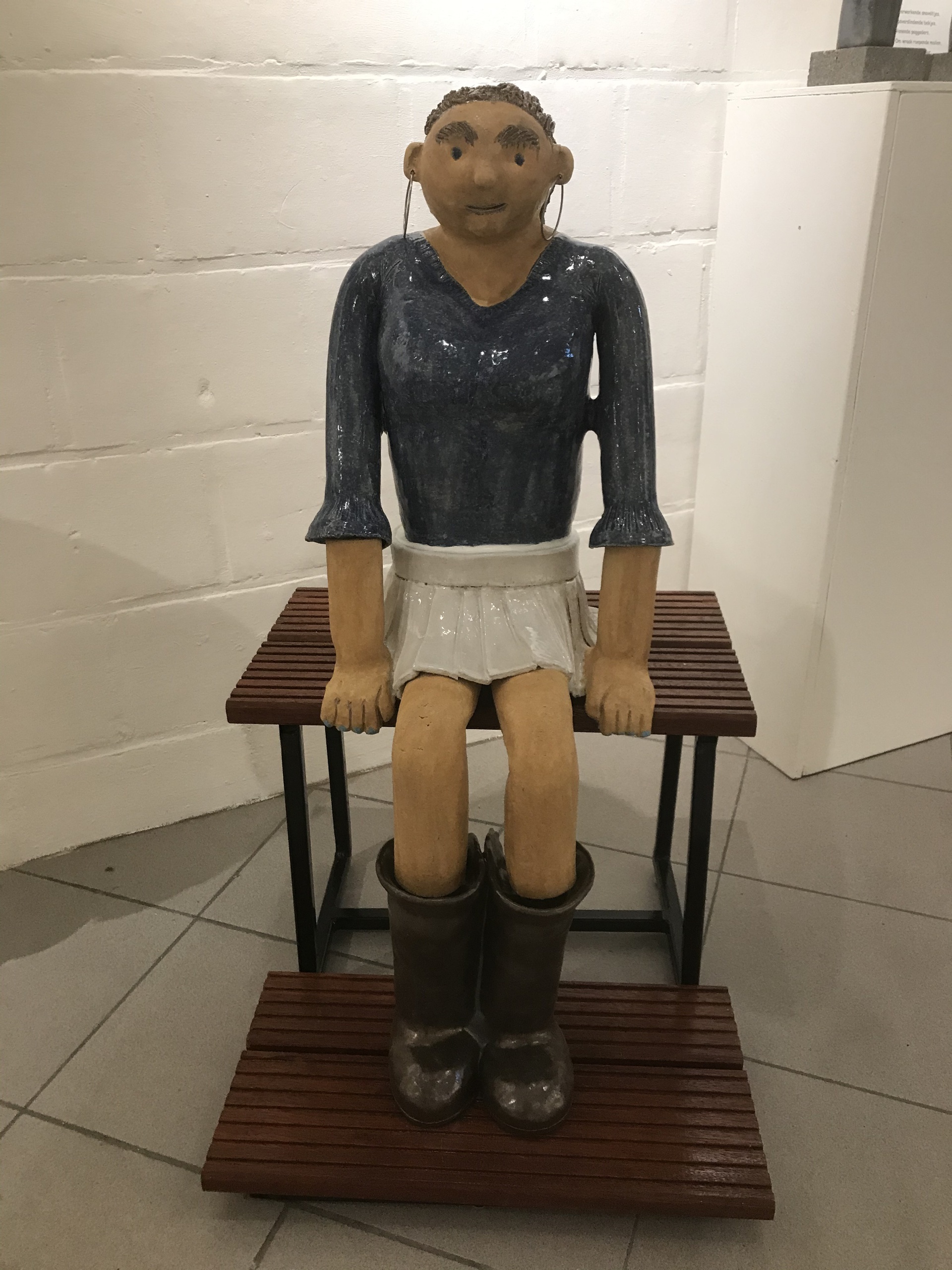 Het meisje zelf is geboetseerd en gebakken zodanig dat het weerbestendig is.Het bankje is eigenhandig stevig gemaakt en geverfd en vormt een mooi geheel met de keramiek.
