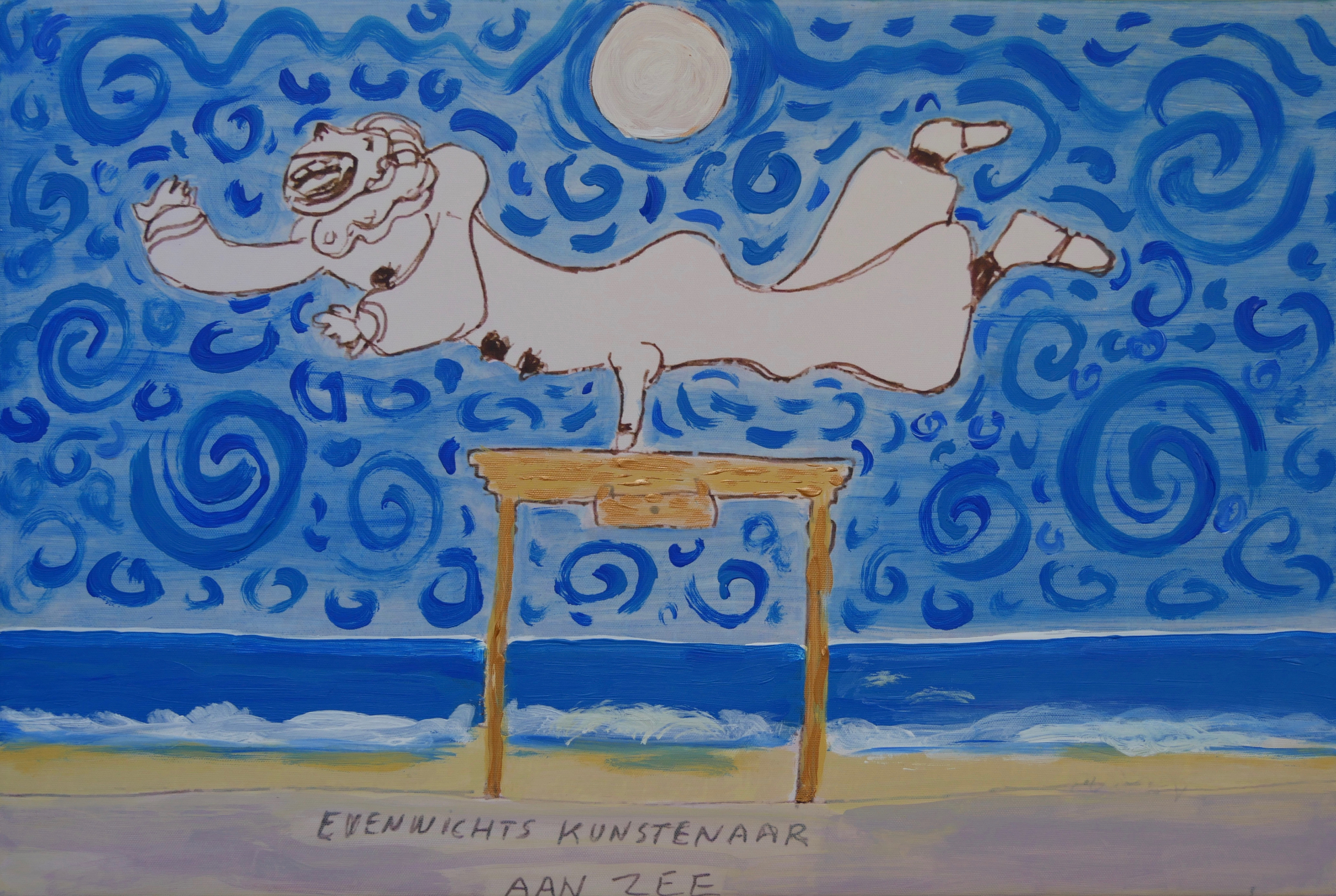 Op een verlaten kust balanceert een vrolijke man met erect geslacht op een antieken kastje, de lucht is vol van spiralen en de zee schuimt uitbundig. Is het de zon of de volle maan, waaronder de man zijn balans zoekt? Het is een kunstenaar, deze clown, die graag uit de verf komt terwijl hij zelf neutraal blijft. Het is de vraag of deze potentiële houding vandaag de dag nog realiteit kan zijn. Dit werk is een duokunstwerk: getekend door Manuel Kneepkens en ge/beschilderd door Jolanda Setz.