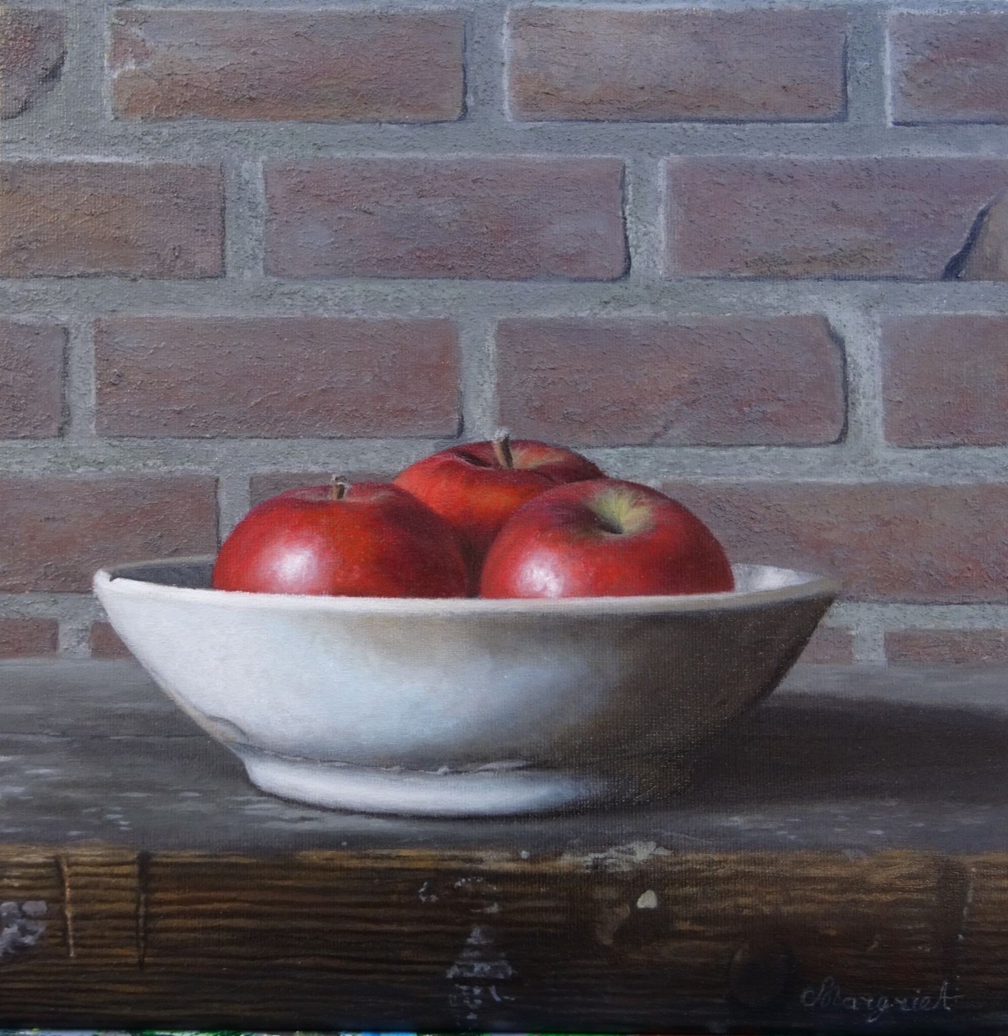 3 appels in een oude schaal naar eigen compositie. Geschilderd met technieken van oude meesters. Over mijn werkwijze heb ik een boek geschreven: Stilleven met 3 appels. (uitverkocht)