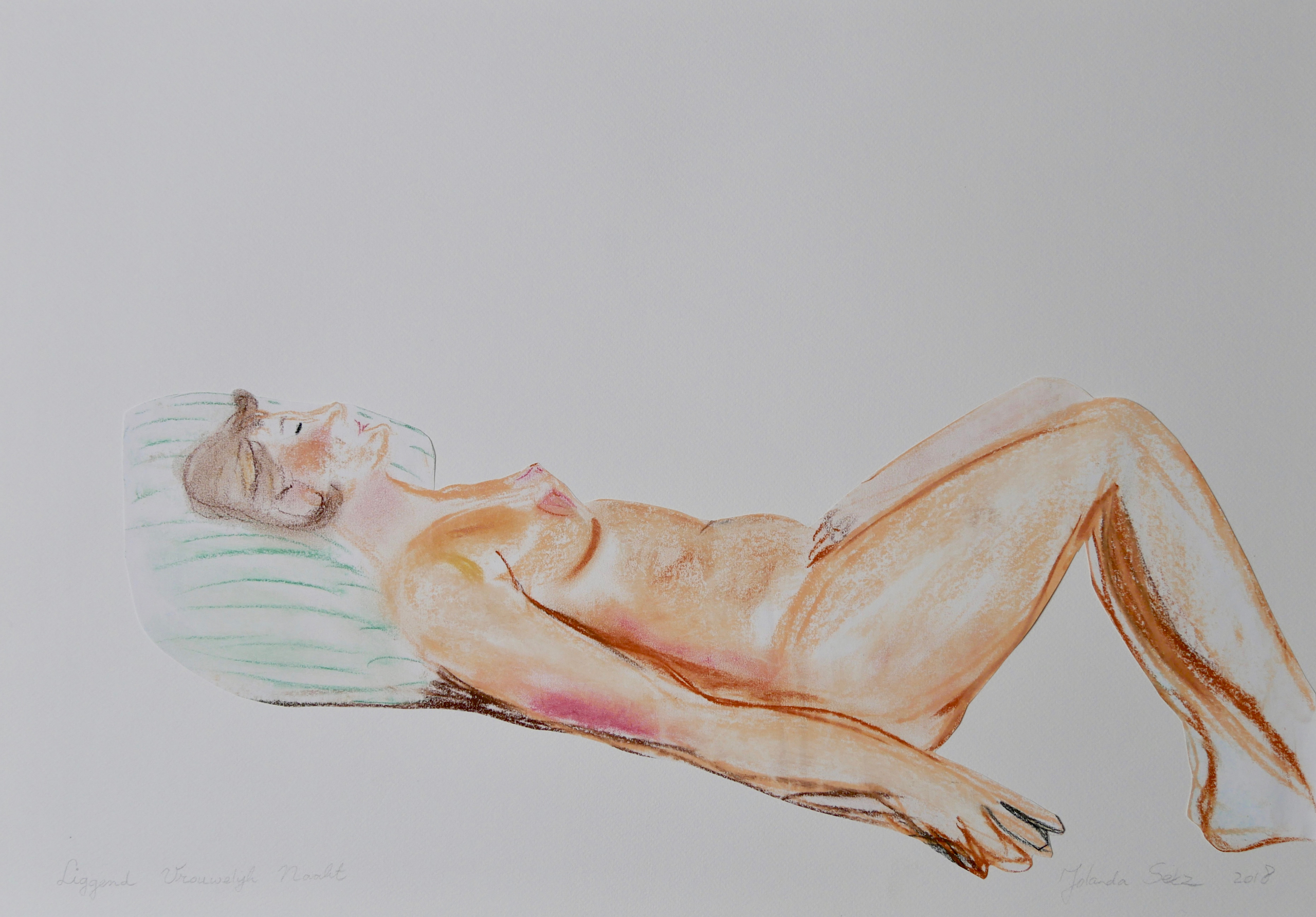 Een liggend vrouwelijk naakt in krijt ligt ontspannen met haar hoofd op een kussen. De tekenaars staan voor haar en zij laat zich in alle rust vastleggen in lijnen op papier. Na het tekenen is de figuur uitgeknipt en op aquarel papier geplakt op een losse manier zodat er zelfs een klein 3d effect onstaat.