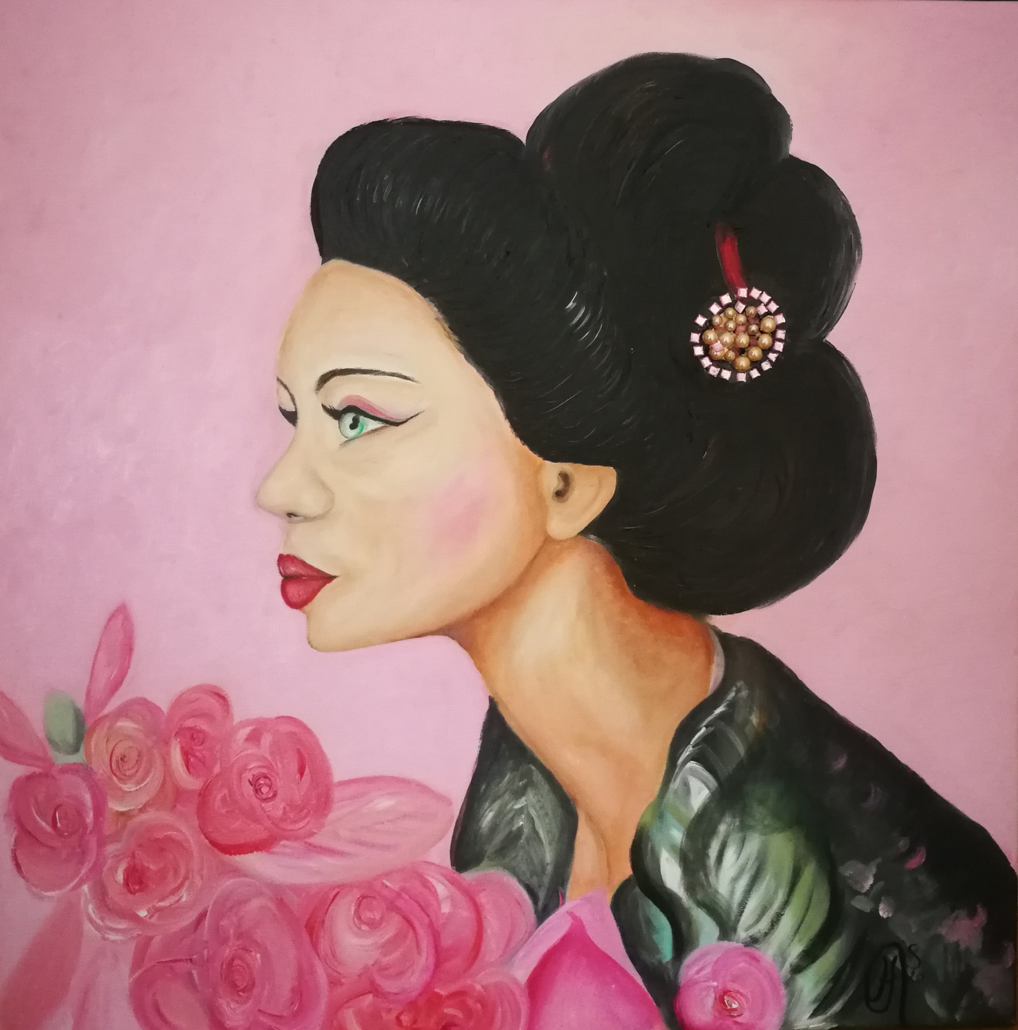 Portret van een aziatische schone. detail: De haarspeld is gemaakt van parels en kralen.