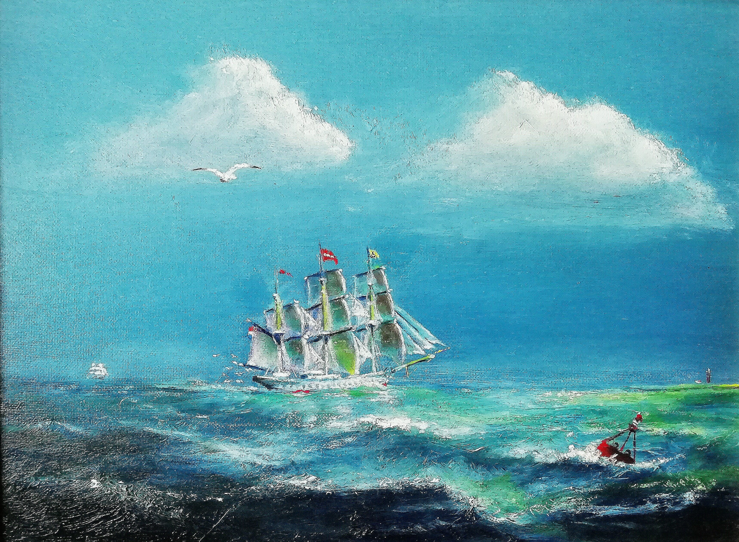 In 1992 maakte ik mijn 1e olieverfschilderij op een paneel. De invloed van mijn leermeester, welke zeeschilder was, is natuurlijk duidelijk te zien. Een driemaster op zee. Het kan eigenlijk niet anders. Een fantasieplaatje van weleer.