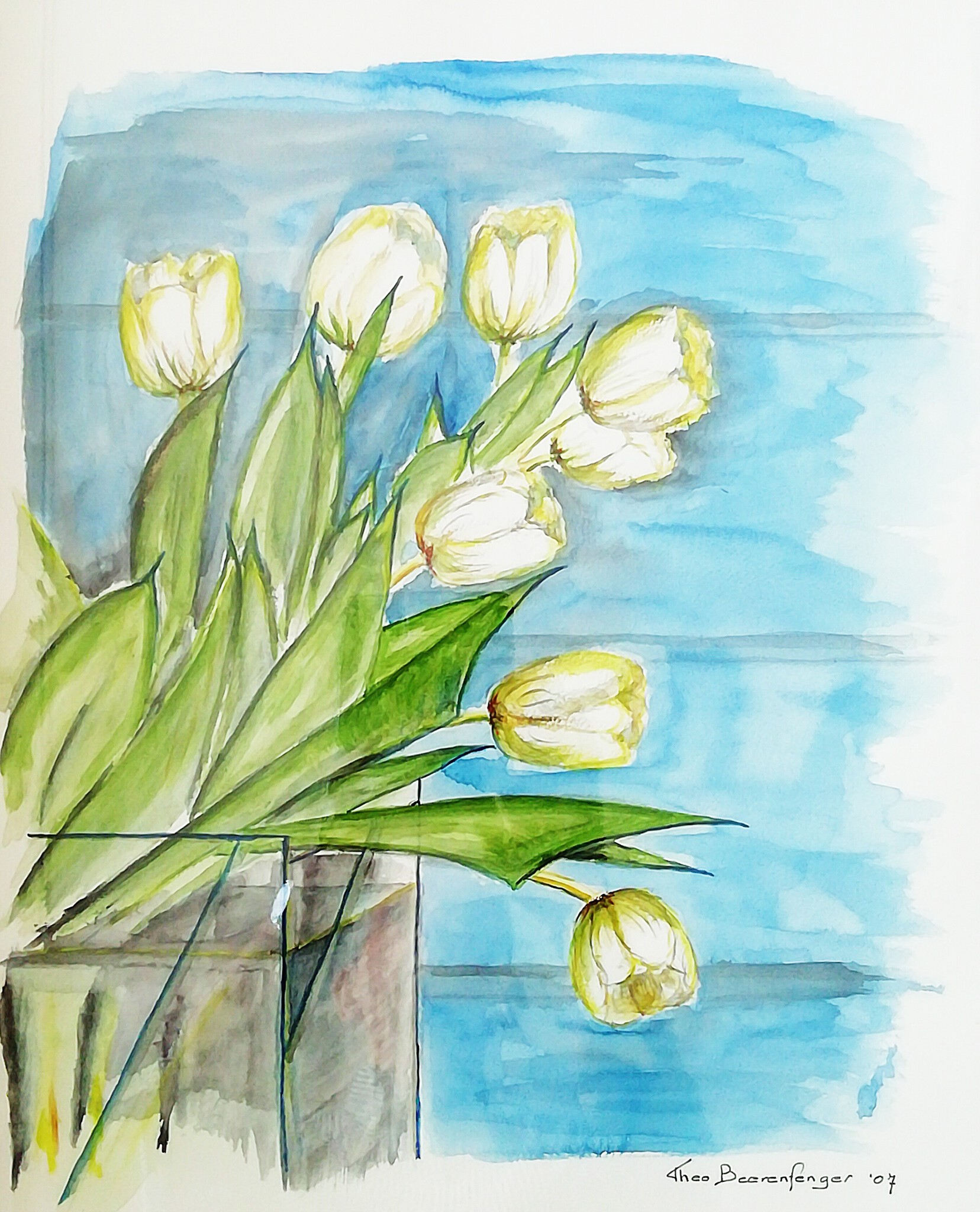 Een snelle aquarel van tulpen in een vierkante glazen vaas.